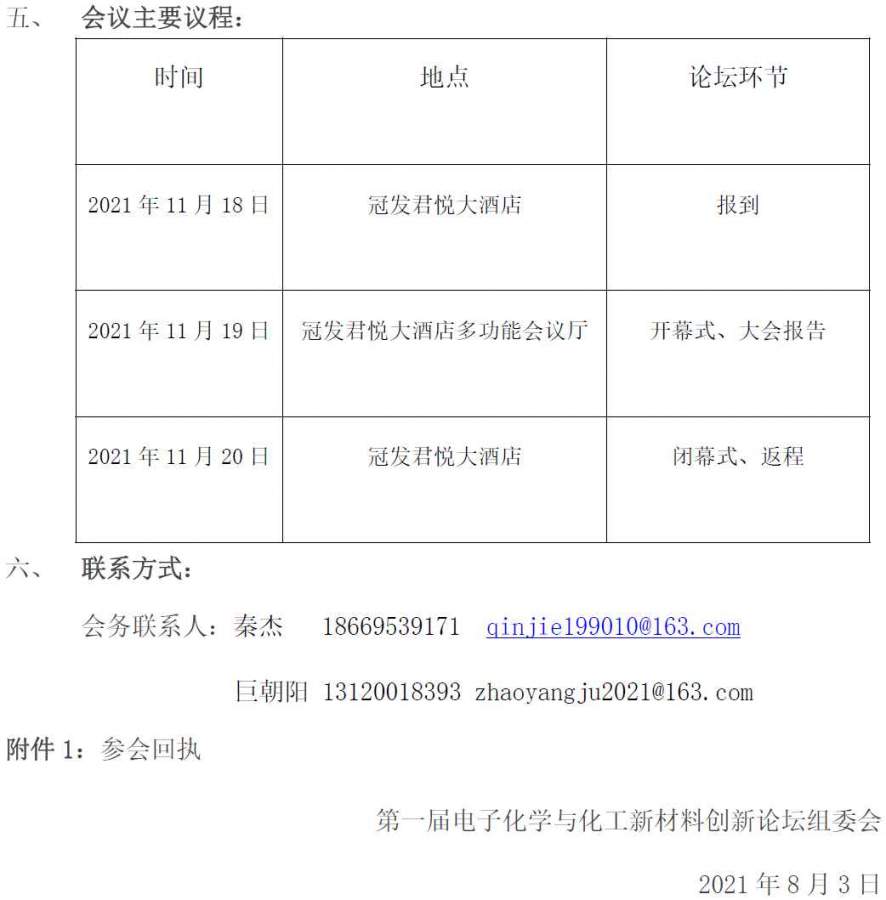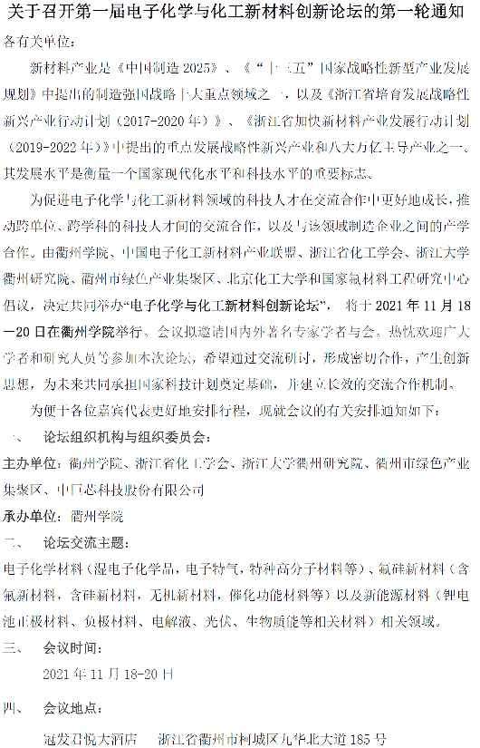 为促进电子化学与化工新材料领域的科技人才在交流合作中更好地成长,推动跨单位、跨学科的科技人才间的交流合作,以及与该领域制造企业之间的产学合作。由衢州学院、中国电子化工新材料产业联盟、浙江省化工学会、浙江大学衢州研究院、衢州市绿色产业集聚区、北京化工大学和国家氟材料工程研究中心倡议,决定共同举办“电子化学与化工新材料创新论坛”,?将于2021年11月18-20日在衢州学院举行。会议拟邀请国内外著名专家学者与会。热忱欢迎广大学者和研究人员等参加本次论坛,希望通过交流研讨,形成密切合作,产生创新思想,为未来共同承担国家科技计划奠定基础,并建立长效的交流合作机制。 发自小木虫Android客户端 |