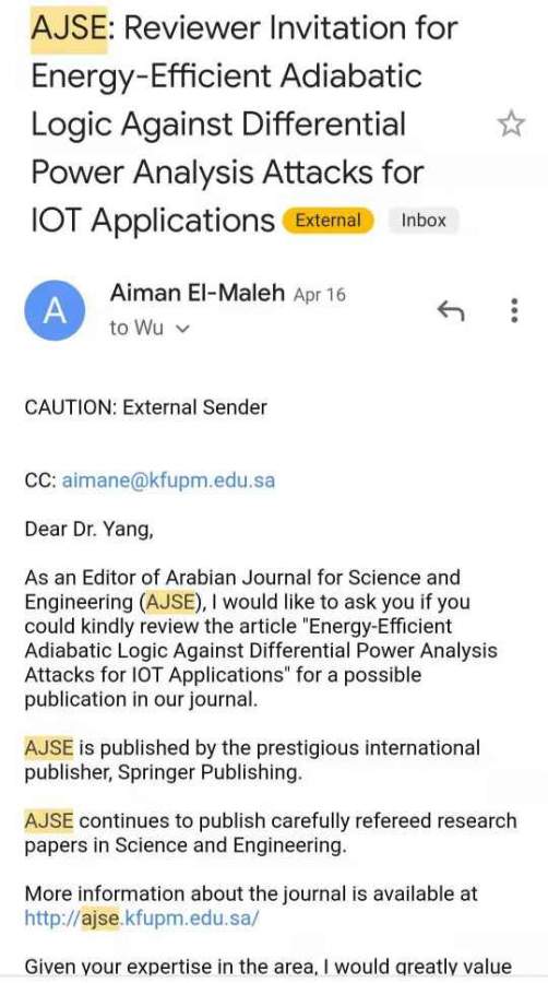 目前下学期博三(直博),前几个月一个阿拉伯期刊邀请做审稿人,低功耗电子工程模拟电路方向,中科院四区影响因子2.3。 《Arabian Journal for SScience and Engeering》 有人说纯是浪费时间,有人却积极地做。 毕业后想到二本大学找一个教职,审稿人reviewer听起来还唬人的,不知道有没有用。 发自小木虫Android客户端 |