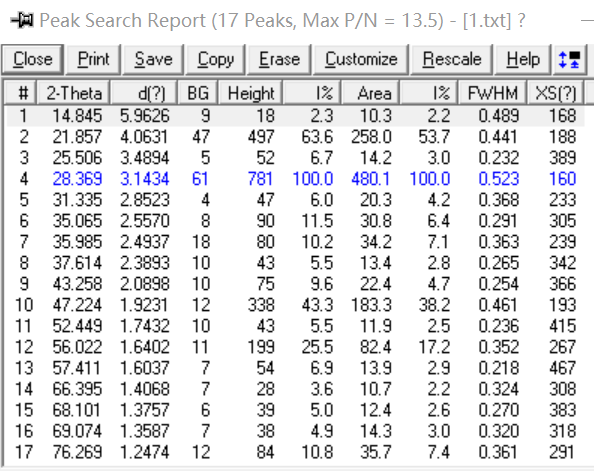 JADE中用谢乐公式计算晶粒大小的问题:在进行物相分析,然后扣除背景,平滑,拟合后,得到一组如下图的数据。后面有软件计算的晶粒大小的结果,我觉得这个不太准,准备用谢乐公式计算一下,可是下面有17组2-theta和FWHM的值,现在问题就是:这17组值我选哪一组或是哪几组来计算呢?还是全部都要计算?求大神指点 1628574192(1).png |
