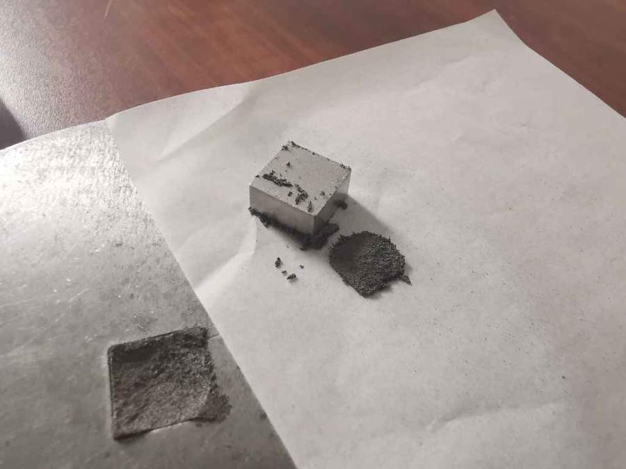 铬钢粉经过球磨——120目过筛后,加粘结剂研磨5分钟,然后压片(冷压)总是出现分层的情况(如图,靠近下模处总是掉一块下来)