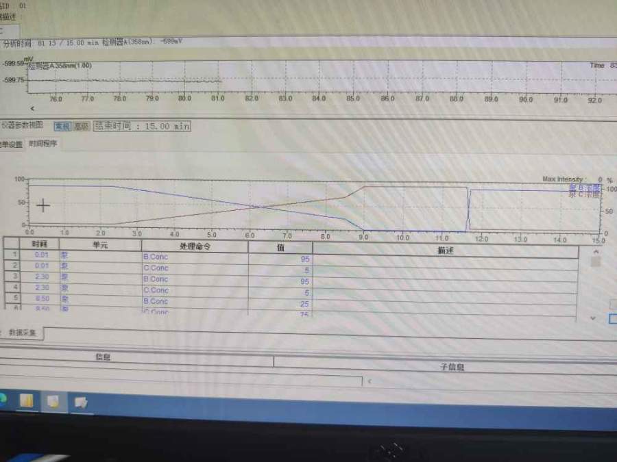 用岛津LC-16测盐酸四环素,流动相A为纯乙腈,流动相B为0.1%甲醇水。梯度洗脱程序如下图。出峰情况去如下图,高浓度(10ppm)时出峰明显,低浓度(0.1ppm)时无法分辨出目标峰,这是由什么引起的,请各位大佬指教 发自小木虫Android客户端 |