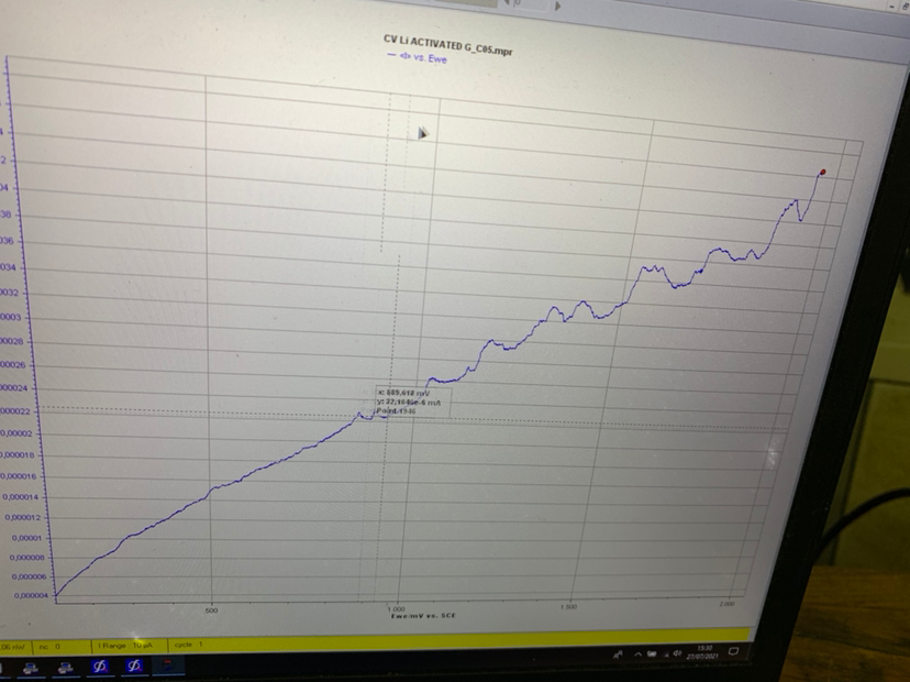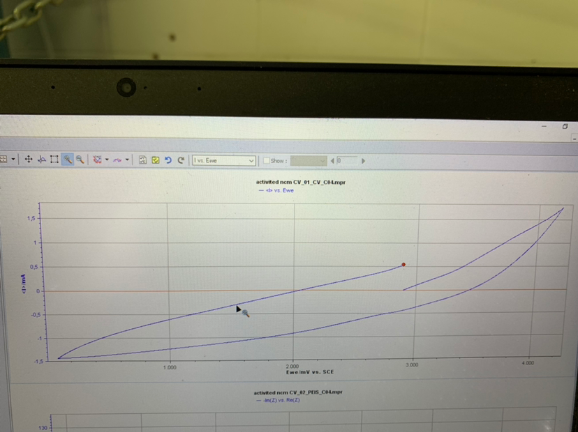 测试的是固态电解质,负极用的锂片,正极用的NCM。Eis测试时候一切正常,如图所示。但循环伏安时候就很奇怪,如果我没理解错的话,应该是没有氧化还原峰。电压范围我设置的0.1到4.2。扫速设的比较高,为10mv。重复了好几次,循环伏安曲线一直都是这样。我也不知道是哪个步骤出了问题,是因为这个体系不能发生氧化还原反应吗?最后附上一半的充放电图。跪求各位前辈大佬答疑。