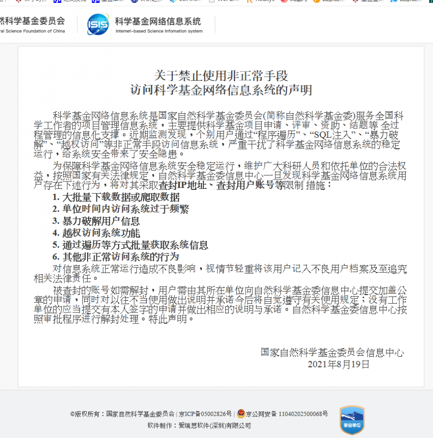 关于禁止使用非正常手段访问国家科学基金网络信息系统的声明已有2人参与