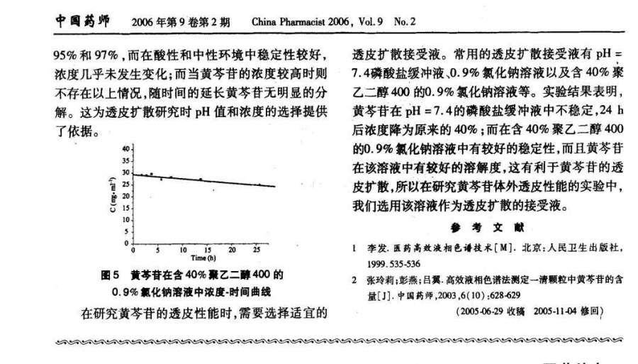 因为黄芩苷不溶于水,所以释放介质没用水。之前做过pbs的,释放度只有10%左右,后来查了一篇文章,说黄芩苷在碱性环境中会降解。并且推荐使用peg400作为释放介质,做了紫外的实验也确实发现黄芩苷在pbs中降解。所以用的50ml 25%peg400的0.9%氯化钠溶液作为释放介质,每次取1ml进液相测量后再补充1ml释放介质。但是后面就会发现峰面积在不断减少,好奇怪啊。求大神指导! 发自小木虫Android客户端 |