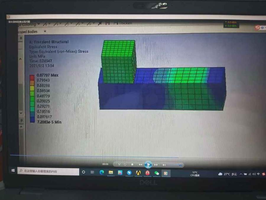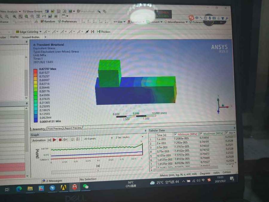 workbench分析滑块在平面滑动,出现滑动滑动距离很短的问题。 滑块滑动分析模型图片与设置与例子一样。 设置的滑块滑动距离15mm,结果出现滑块滑动距离很短的问题,约3~5mm;但能在平面上看到接触应力的云图正常移动,移动距离15mm。 不知什么地方设置错误?@wuming524 |