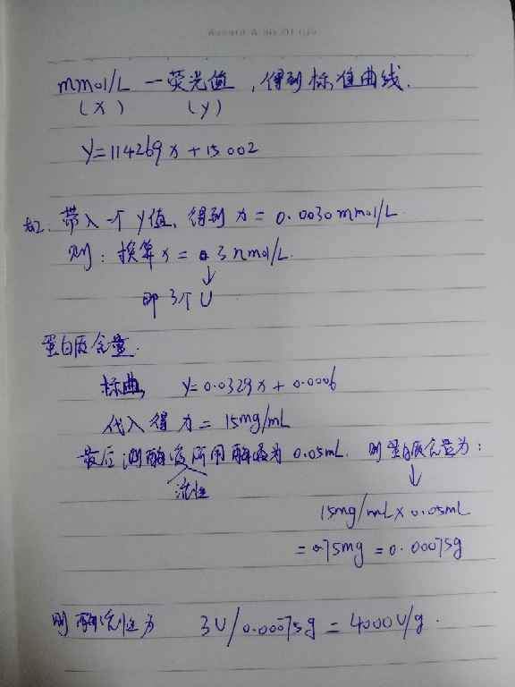 最近用了4-甲基伞形酮油酸酯为底物测酸性、中性脂肪酶、磷脂酶活性,测了蛋白浓度,做了荧光标曲,测了荧光值。数据处理不清楚,求教大佬指点下具体数据怎么计算 发自小木虫Android客户端 |