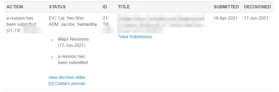 TIE投稿五个月,经历了一次大修,目前Awaiting EIC Decision状态三天了,祈祷~~