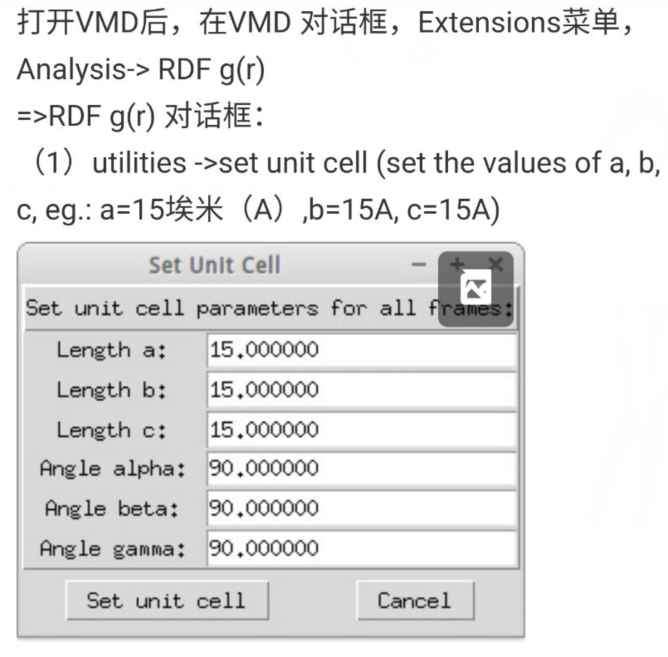 请问各位:用VDM分析径向分布函数g(r)的时候,这个界面max. r.要怎么设置呢? 我分别设置2和5做了g(r)和g(r)的积分,峰值位置没啥影响,但其他部分,还有有一些影响的。网上有教程说:分析rdf时,横坐标也就是max r不能超过盒子最小边长的一半,也就是得满足最小映像约定。如果max r的取值大于盒子最小边长的一半,就有可能重复算到一个粒子和它的映像粒子,这使得程序的周期性判断失准。 这里的盒子最小边长是不是指晶格参数a,b,c的最小值?还是这个: 但,新版的VMD貌似没有这个unit cell设置的窗口了。请问大家一般怎么设的呢?@内工大_材料_vasp分子动力学 发自小木虫Android客户端 |