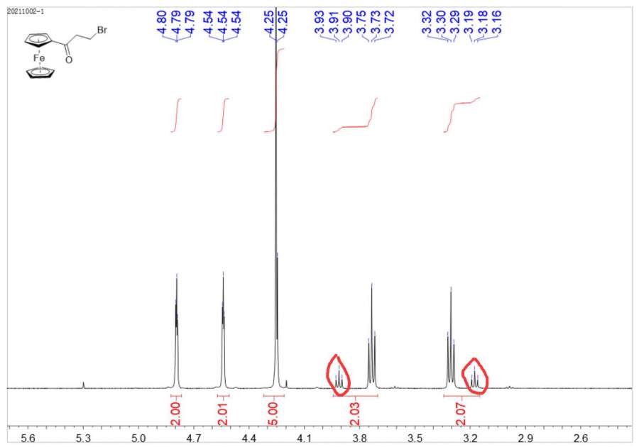 请教各位大佬,我做的二茂铁酰基化反应,核磁如图所示,在3.91和3.18出现在的三重峰是什么呢?做了好几次都是这样。而且必须两个三重峰一起算积分才是2个H。不太懂,请大佬们帮忙解答,谢谢啦! 发自小木虫Android客户端 |