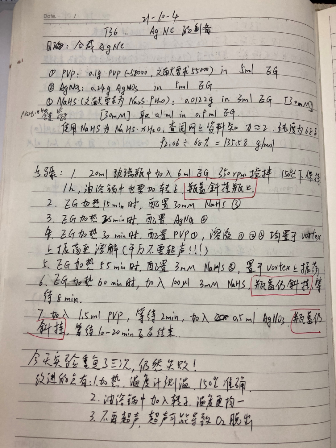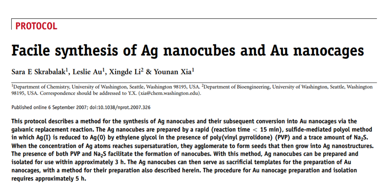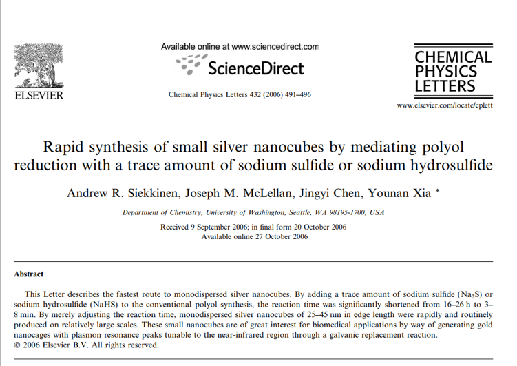 参照Xia组06、07年文献“Rapid synthesis of small silver nanocubes by mediating polyol reduction with a trace amount of sodium sulfide or sodium hydrosulfide,Chemical Physics Letters 432 (2006) 491–496”和“Facile synthesis of Ag nanocubes and Au nanocages,NATURE PROTOCOLS, 2007, 9, 2, 2182-2190 ” 具体的步骤如下图所示,硫氢化钠后来换成了硫化钠,但是溶液颜色也得不到改善。 我的溶液颜色特别淡,不知什么原因,希望各位小伙伴指导一下 发自小木虫IOS客户端 |