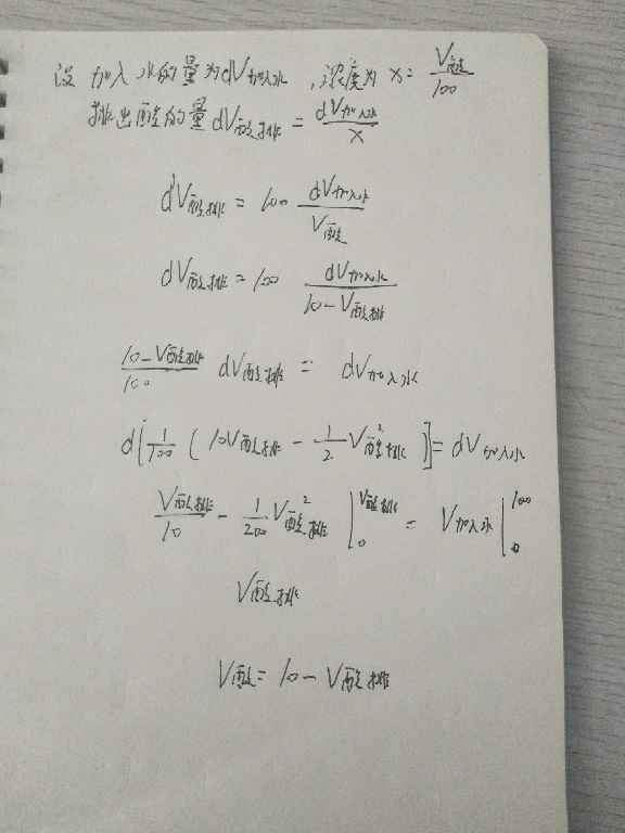 已知在水槽中有100L的溶液,溶液中中有10L的酸和90L的水。 从一端向水槽中加入100L水,注意:在加水的同时,从另一端将水槽中的溶液放出,假设放入和放出是同步进行的,直到加够100L水,停止溶液放出,也停止加水。 问最后溶液中的酸有多少升? 急急急!!! 感谢虫友们的帮助!!! |