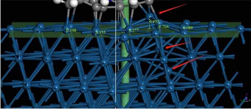 | 各位前辈,我计算一个大芳香烃在Pt111表面的吸附,4层Pt原子,我只固定了最下面一层,最终模型如下图,上三层Pt原子都有很大程度的偏移,最高都快1埃了,请问这是什么原因 |