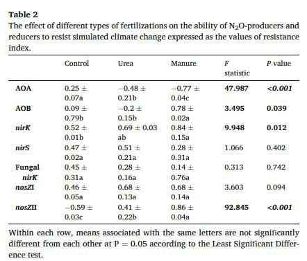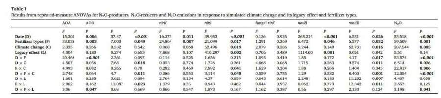 请问图一里面的anovas这个咋看呀,只用看p值吗,f值是啥呀?图二里面数据后面跟着的abc是什么意思呀?还请大神教教我。文献为NosZ clade II rather than clade I determine in situ N2O emissions with different fertilizer types under simulated climate change and its legacy @天使托 发自小木虫Android客户端 |
