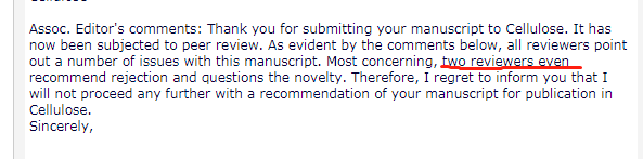 cellulose投稿审稿结束后,三个审稿人,有一个说创新性不好,表征方法老套,反正批判了一翻说不行。然后另外两个都说可以,结果编辑说拒稿的原因是有两个人审稿人质疑创新性,建议拒稿,这种情况下,是不是编辑看错了,申诉有无成功的可能性,有没有大神知道如何申诉?感谢