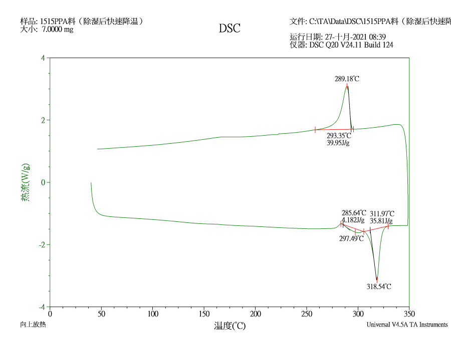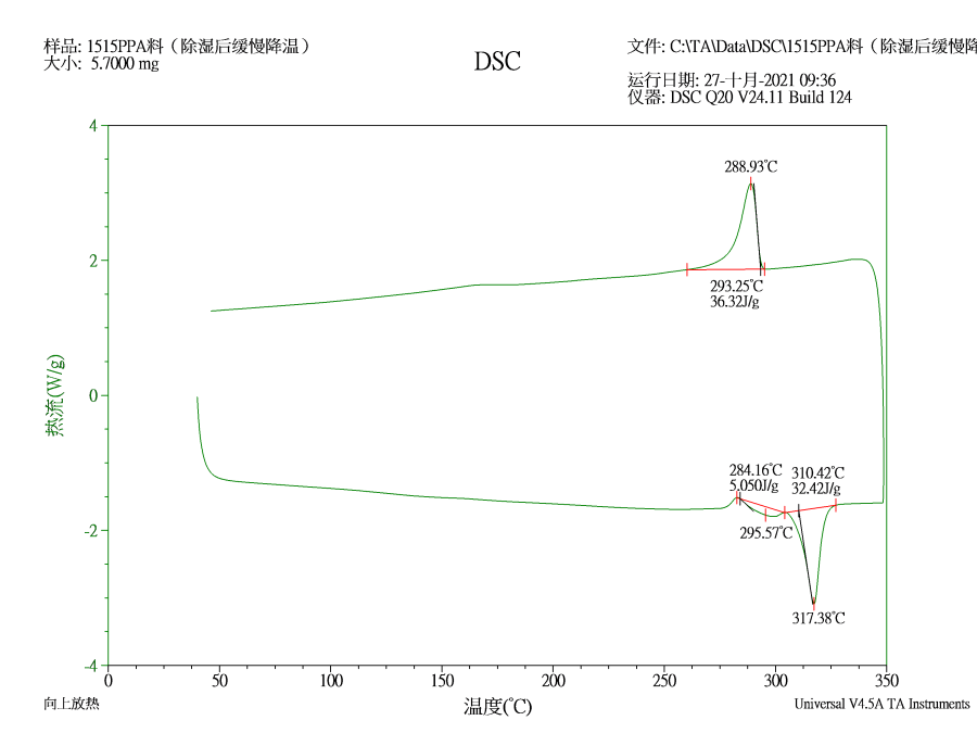 我们有一款PPA材料,在工艺过程中,会经过170℃的高温 烘烤,现在想知道烘烤完后直接置于空气中冷却和在烤箱中缓慢回温冷却对材料的性能是否会有什么影响,请问DSC测试哪些点可以看出对材料性能的差异,PPA材料是加了水口的,原料和水口的比例是2:8. 1515PPA料(除湿后缓慢降温).png 1515PPA料(除湿后快速降温).png |