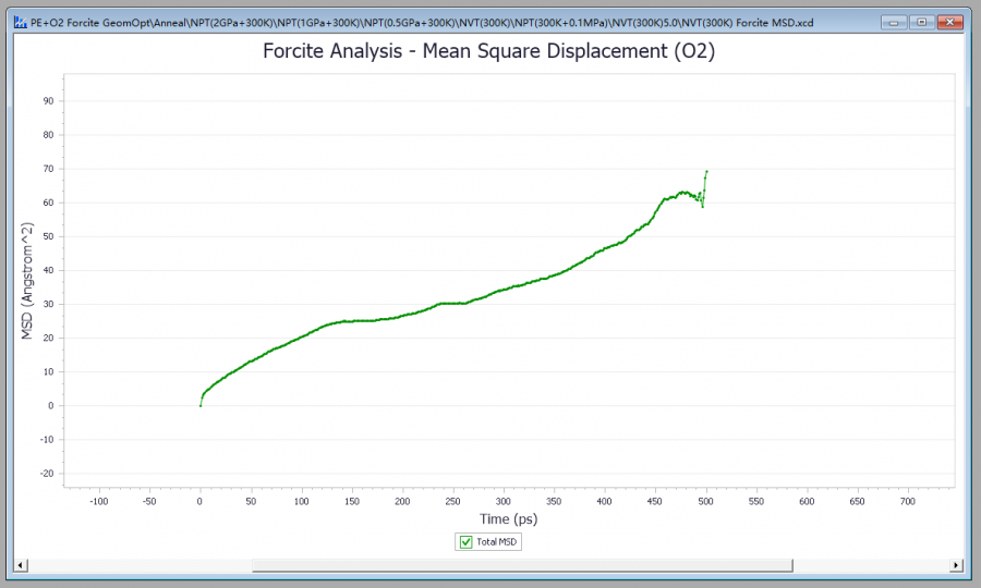 请问下,我是用MS来模拟O2在PE材料中的扩散。最后用NVT进行500ps的统计。一些论文中说,对于log(MSD)和log(t)的图,需要斜率=1,才是正常扩散,才能用爱因斯坦方程,也就是扩散系数=斜率a/6。但是我log画图后,不管怎么样拟合,斜率都远小于1,那我这个是不是非正常扩散呢?请问是我哪里出错了吗? MSD和t的图 log(MSD)和log(t)的图 |