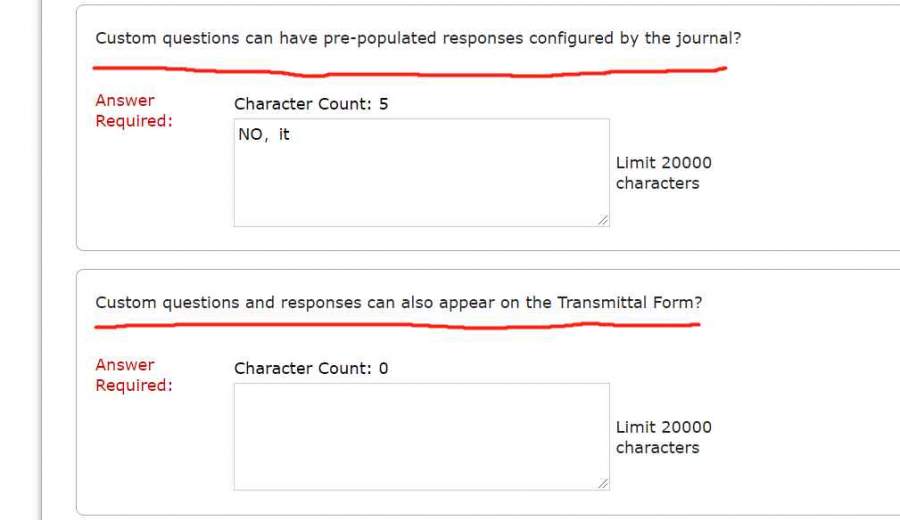 1.Custom questions can have pre-populated responses configured by the journal? 2.Custom questions and responses can also appear on the Transmittal Form? 毕业保命,先谢谢各位好心人! 发自小木虫Android客户端 |