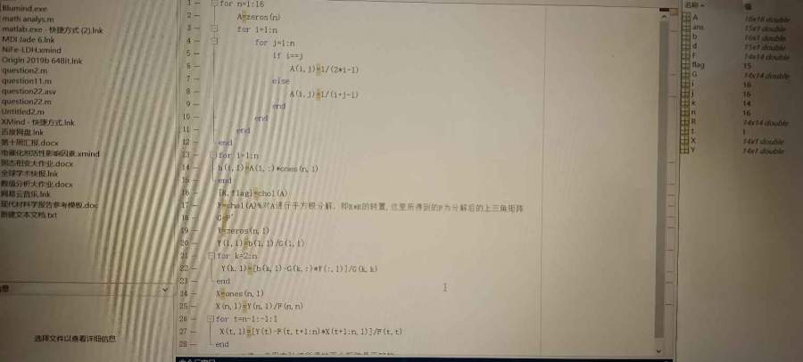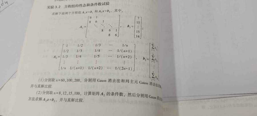 for n=1:16 A=zeros(n) for i=1:n for j=1:n if i==j A(i,j)=1/(2*i-1) else A(i,j)=1/(i+j-1) end end end end for i=1:n b(i,1)=A(i, *ones(n,1)end [R,flag]=chol(A) F=chol(A)%对A进行平方根分解,即R*R的转置,这里所得到的F为分解后的上三角矩阵 G=F' Y=zeros(n,1) Y(1,1)=b(1,1)/G(1,1) for k=2:n Y(k,1)=[b(k,1)-G(k, *Y(:,1)]/G(k,k)end X=ones(n,1) X(n,1)=Y(n,1)/F(n,n) for t=n-1:-1:1 X(t,1)=[Y(t)-F(t,t+1:n)*X(t+1:n,1)]/F(t,t) end |