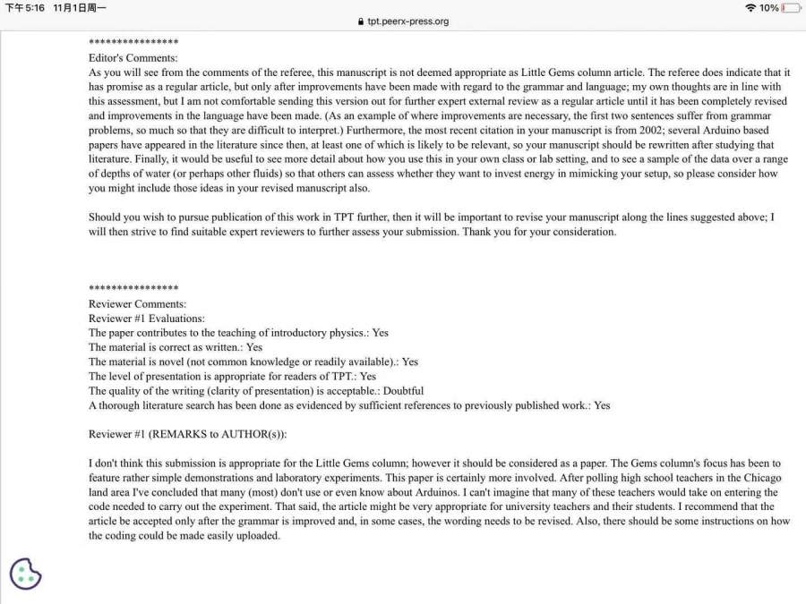Q: 是要改稿件格式适应栏目,还是改栏目 (?) A: 文章范围很大, 不适合在 TPT (The Physics Teacher) 杂志的 "Little Gems" 小课题专栏登; 高中老师大多不熟 Arduino, 但很适合大专教学 ---------- 大问题很多, 英文烂相对事小 (不修不行, 编辑连文章开头两句都看不懂) - 参考书目中的最新文章2002见刊, 之后发表的相关文章很多, 建议细读若干("至少其中某一" 新文章后重写- 编辑: "尽力详述如何在不同水位或不同流体环境用此教具" - 内审: "实验步骤描述不清, 没提怎么上传代码 |