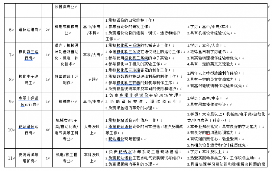 “国之重器”——中国散裂中子源是我国“十一五”国家重大科技基础设施,是世界上第四台、我国首台脉冲型散裂中子源。项目位于广东省东莞市,一期规划用地400亩,总投资约23亿元,由中国科学院和广东省人民政府共同建设,项目法人单位为中国科学院高能物理研究所。中国散裂中子源主要包括1台负氢离子直线加速器、1台快循环质子同步加速器,1个靶站,一期3台谱仪及相应配套设施及土建工程。目前,中国散裂中子源已顺利通过国家验收并正式投入运行,产出了一批高质量的研究成果,在材料科学和技术、生命科学、物理、化学化工、资源环境、新能源等诸多领域具有广泛应用前景,将对我国探索前沿科学问题、攻克产业关键核心技术、解决“卡脖子”问题具有重要意义。中国散裂中子源二期工程已纳入国家“十四五” 规划, 二期工程包括新建11台中子谱仪和实验终端, 同时提升加速器和靶站功率到500kW。 根据工作需要,散裂中子源科学中心现公开招聘人才派遣岗位30名左右。 薪酬待遇: 1、提供具有竞争力的薪资,高标准缴纳五险一金(东莞市社保金卡,公积金缴纳比例12%),健全的福利待遇(节日慰问、健康体检、带薪年假等); 2、优良的工作环境,专业的岗位培训。 工作地点:广东省东莞市 应聘要求: 1、应聘者面试时须提供以下材料: (1)个人简历(包括详细个人信息、教育经历等); (2)学历学位证书、身份证、学习成绩单等复印件; 2、 有意应聘者请将简历发至邮箱fengmn@ihep.ac.cn(注:请写明应聘岗位)。 3、 面试时间:另行通知 联系方式: 联 系 人:冯老师 联系电话:0769-89156323 1637042874(1).jpg 1637042900(1).jpg 1637042920(1).jpg [ 来自版块群 广东 ] |
