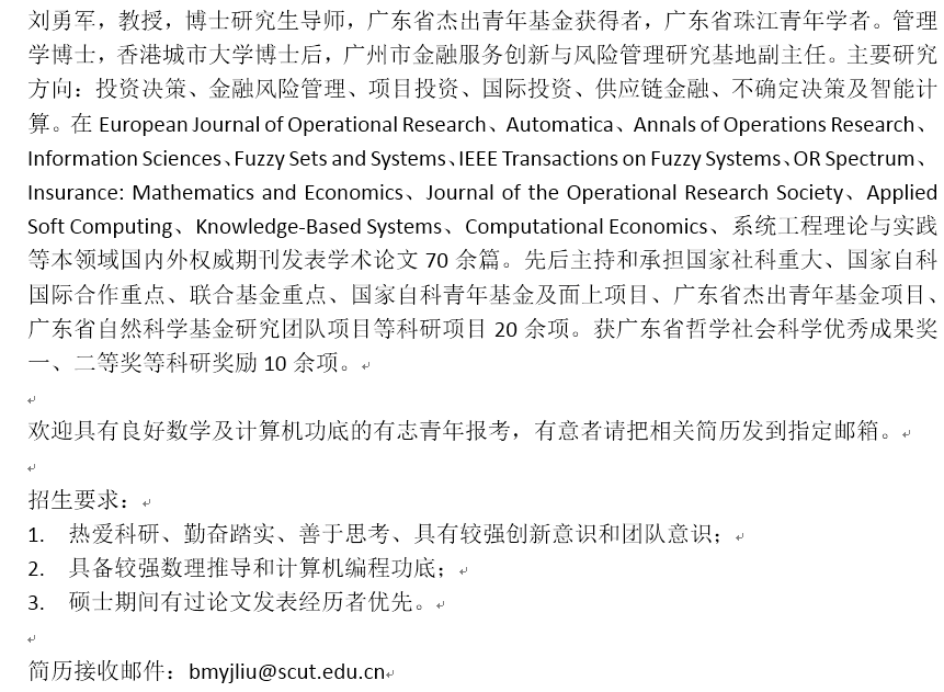 华南理工大学工商管理学院金融工程与风险管理研究团队招生申请审核制博士