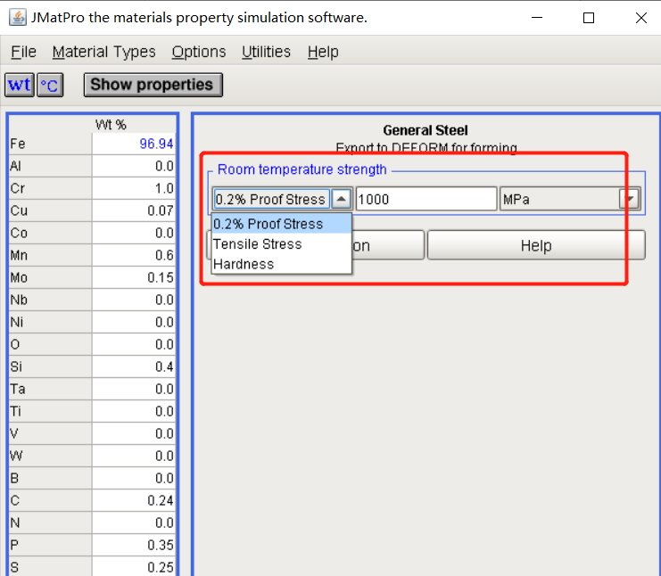 如图1,Jmatpro中Sample Text已知材料各元素成分含量下,其室温强度下0.2% proof stress or Tensile Stress or Hardness的值为多少?设置依据是什么? 1637715897(1).jpg |