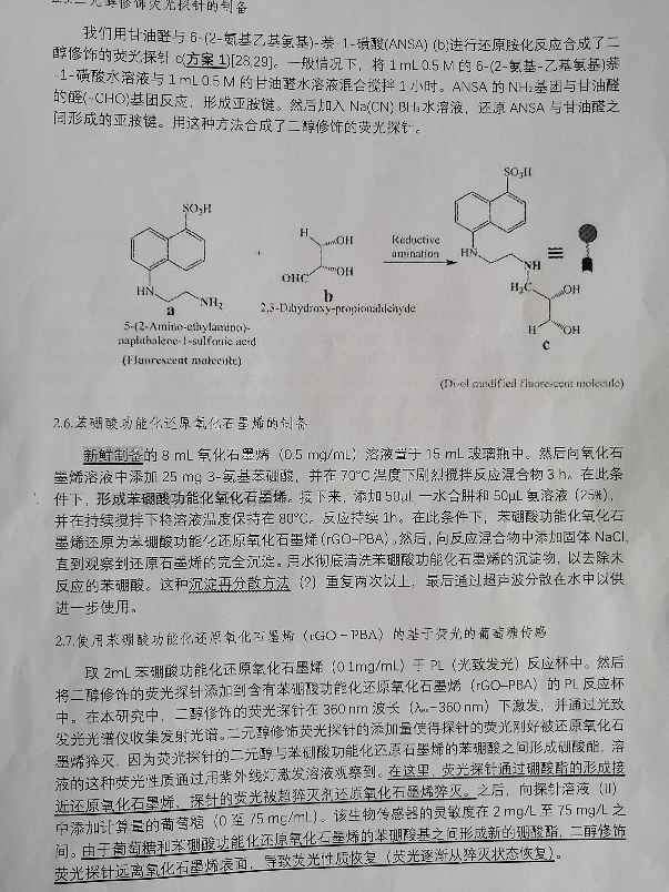 有没有合成氨基苯硼酸功能化氧化石墨烯的大佬呢?我合成的材料一直都不对。用紫外表征总是出问题。紫外光谱如下。用的合成方法如下图。