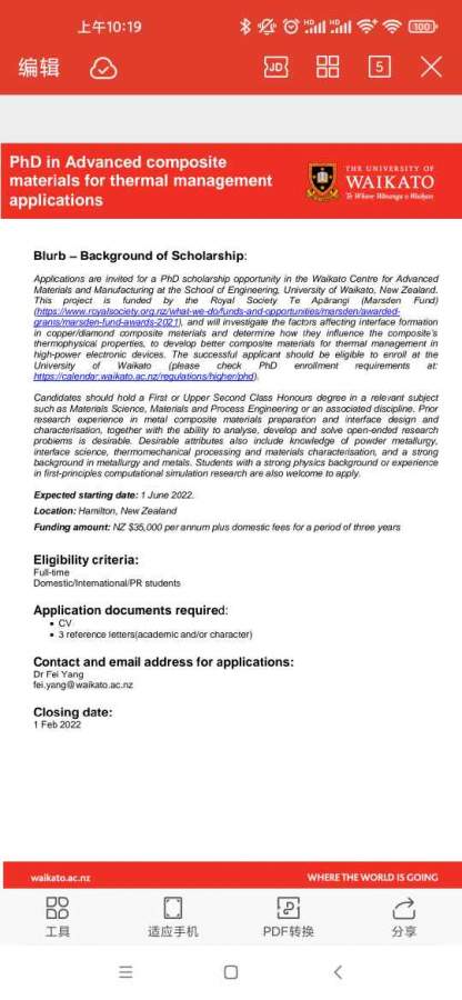 Blurb-Background of Scholarship: Applications are invited for a PhD scholarship opportunity in the Waikato Centre for Advanced Materials and Manufacturing at the School of Engineering,University of Waikato,New Zealand This project is funded by the Royal Society Te Aparangi (Marsden Fund) (https://www.royalsociety.org.nz/ ... n-fund-awards-2021), and will investigate the factors affecting interface formation in copper/diamond composite materials and determine how they influence the composite's thermophysical properties, to develop better composite materials for thermal management in hiah-power electronic devices,The successful applicant should be eliaible to enroll at the UniversityofWaikato(pleasecheckPhDenrollmentrequirements at: https://calendar.waikato.ac.nz/regulations/higher/phd). Candidates should hold a First or Upper Second Class Honours degree in a relevant subject such as Materials Science,Materials and Process Engineering or an associated discipline.Prior research experience in metal composite materals preparation and interface desian and characterisation, together with the ability to analyse,develop and solve open-ended research problems is desirable. Desirable attributes also include knowledge of powder metallurgy interface science.thermomechanical processing and materials charactersation, and a strong background in metallurgy and metals. Students with a strong physics background or experience in first-principles computational simulation research are also welcome to apply. Expected starting date:1 June 2022 Location:Hamilton, New Zealand Funding amount:NZ $35,000 per annum plus domestic fees for a period of three years Eligibility criteria: Full-time Domestic/International/PRstudents Application documents required: CV 3reference letters(academic and/or character) Contact and email address for applications: Dr Fei Yang fei.yang@waikato.ac.nz Closing date:1 Feb 2022 waikato.ac.nz WHERE THE WORLD IS GOING |