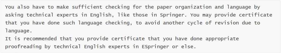本人投了Springer旗下的一个期刊,最近收到了大修的意见。其中Editor给的意见中有语言的问题,如下图。请问各位大神这是什么意思,是要让我用Springer里的润色服务吗?我看还要提供certificate,这个是什么意思呢?是润色机构会提供签名证书的意思吗?然后提交这个证书? 还有有没有推荐的润色服务呢,Springer旗下的AJE怎么样啊? 第一次投期刊,还请大神指点一下。 发自小木虫Android客户端 |