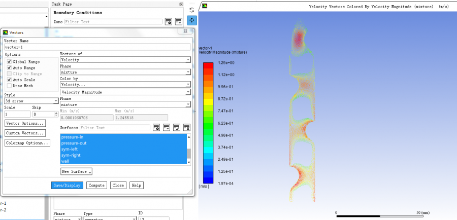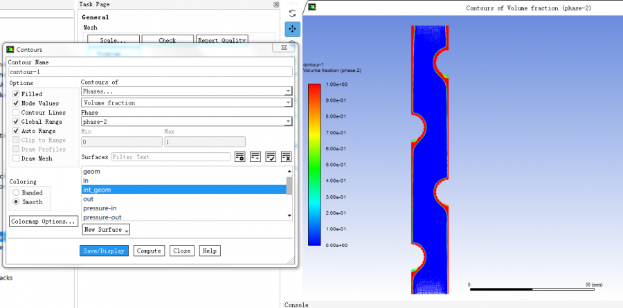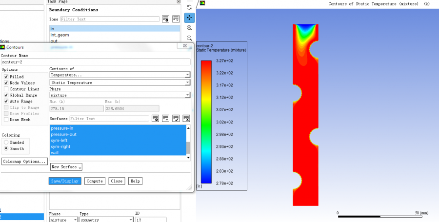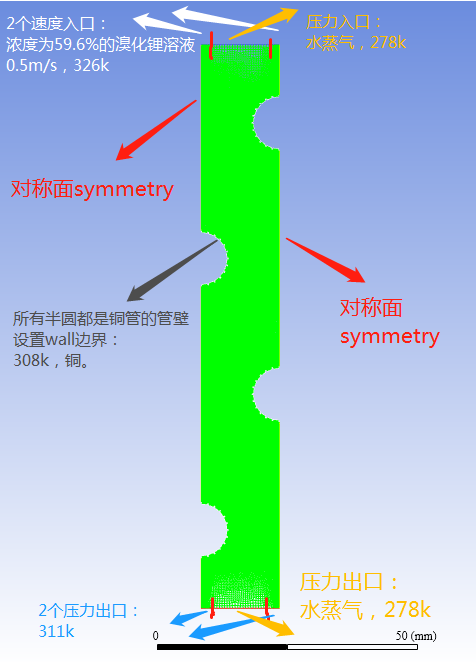 做的是溴化锂溶液降膜吸收。 两个相:一个是溴化锂溶液,一个是水蒸气,表面张力0.085。 工作环境设置了870pa,重力加速度-9.81m/s^2,工作温度278k。 时间步长0.0002s。 边界条件的设置如图所示,phase图挺好的,但是温度云图中间部分都没有变化,求各位大佬指点,应如何修改呢?谢谢! phase图.png 边界条件设置.png 速度矢量图.png 温度云图.png |