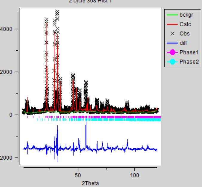 求租各位大神,如图,刚接触精修,修到RWP20就怎么也降不下去了。峰的位置基本一致了,但是强度总是上不去,特别是有几个峰。请问还需要改些什么参数啊?如果有大神感兴趣愿意帮忙修一下感激不尽! 两个相,还有少量不知道是什么的杂质。原始XRD强度不是很好,但是也没办法了,不让测太长时间。 (原始数据和cif见附件,cif1和2中的Ca和Y需要换成Tb元素) 211223.jpg |