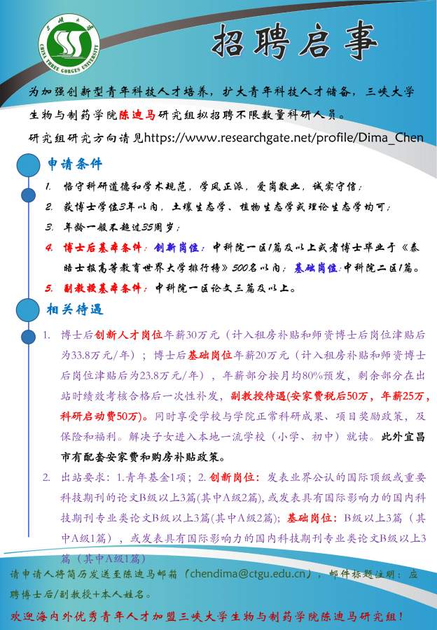 出站要求:1.青年基金1项;2. 创新岗位:发表业界公认的国际顶级或重要 科技期刊的论文B级以上3篇(其中A级2篇), 或发表具有国际影响力的国内科 技期刊专业类论文B级以上3篇(其中A级2篇); 基础岗位:B级以上3篇(其 中A级1篇),或发表具有国际影响力的国内科技期刊专业类论文B级以上3 篇(其中A级1篇)。请申请人将简历发送至陈迪马邮箱(chendima@ctgu.edu.cn),邮件标题注明:应 聘博士后/副教授+本人姓名。 |