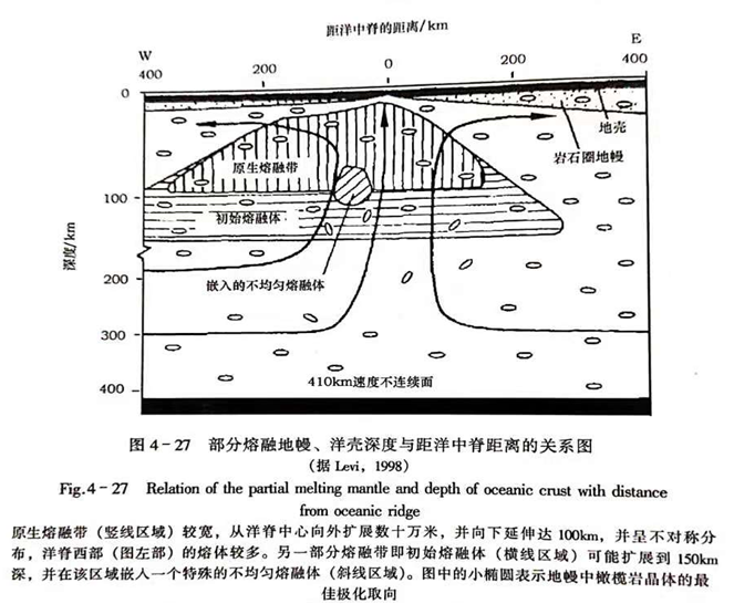 地幔流向东运动,幔流携带的已经熔融出来的岩浆等低密度物质在洋脊西侧遇到洋中脊因穹隆效应上浮,汇集成了岩浆房,经过洋中脊后东侧已熔融出来的岩浆就少了。因此两侧不对称,低速带不在洋中脊正下方。