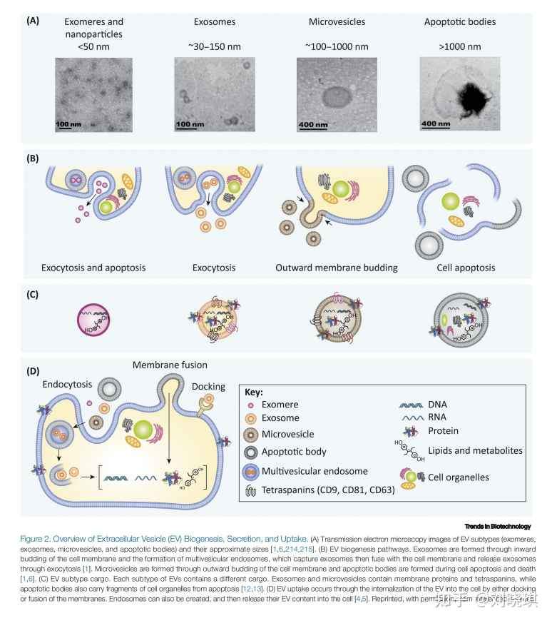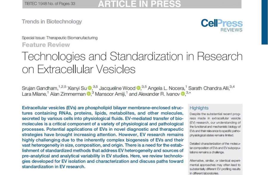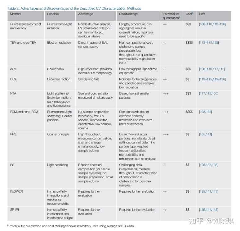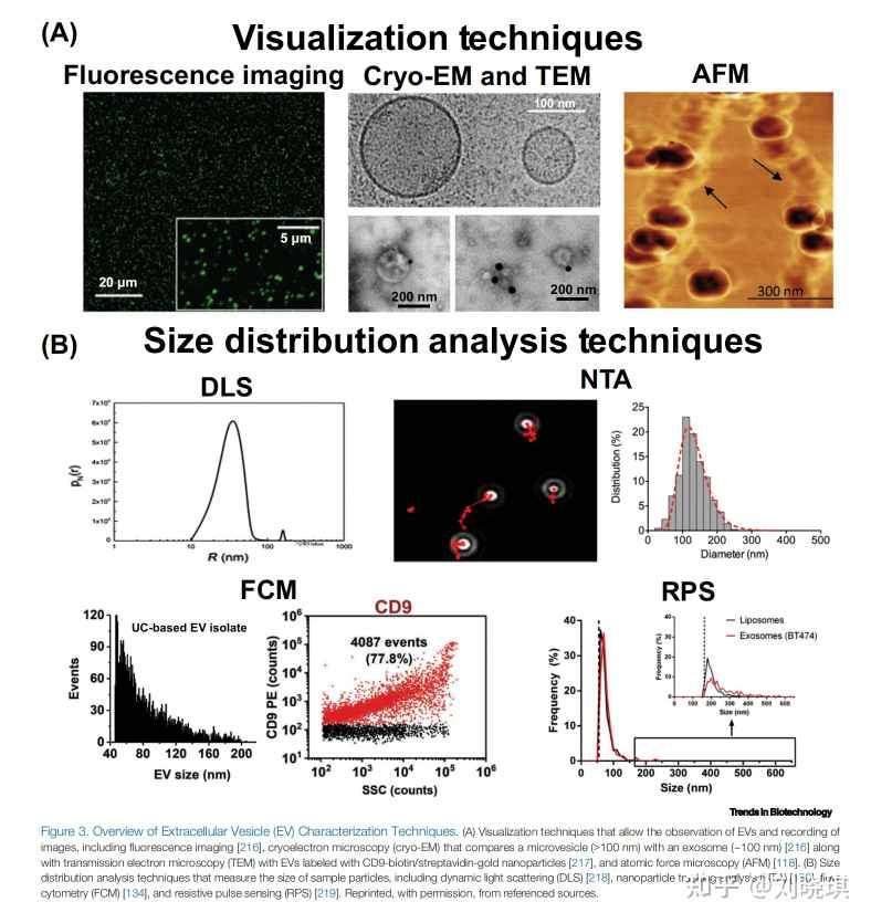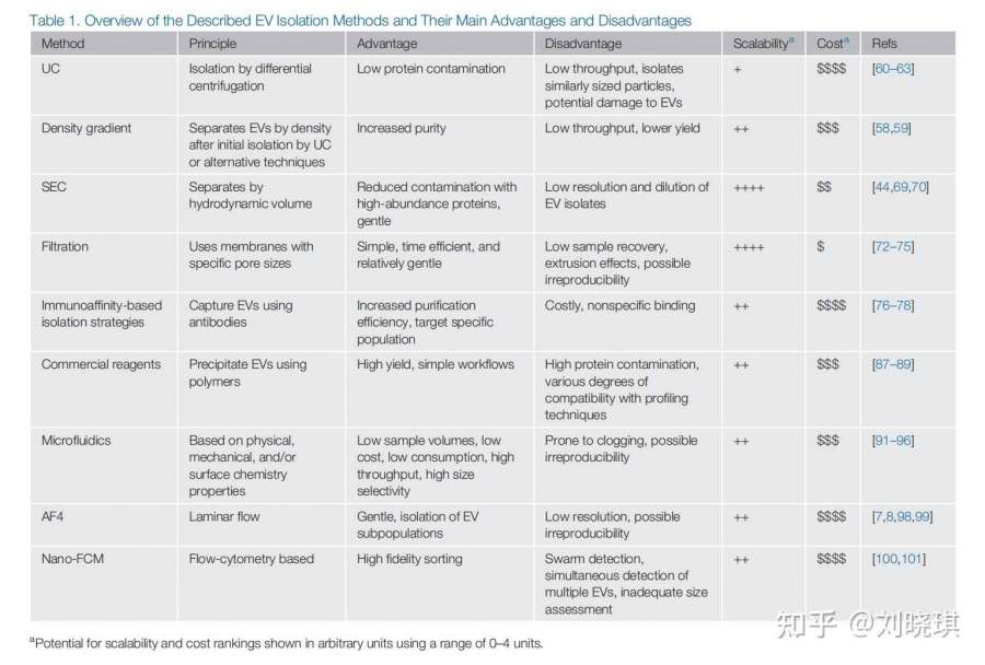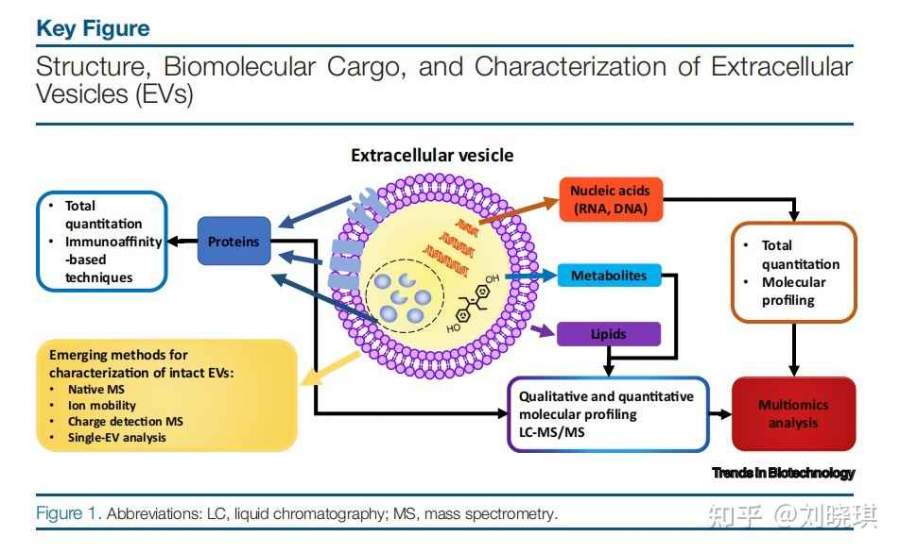今天分享一篇发表在 Trends in Biotechnology(2021年IF=19.536)上的文章,名为《Technologies and Standardization in Research on Extracellular Vesicles》[1](细胞外囊泡的技术与标准化研究)。 细胞外囊泡(EVs)是一种磷脂双层膜封闭结构,包含RNA、蛋白质、脂质、代谢物和其他分子,由各种细胞分泌到体液中。EV介导的生物分子转移是各种生理和病理过程的重要组成部分。EV在新的诊断和治疗策略中的潜在应用已经引起了越来越多的关注。然而,由于EV固有的复杂的生物发生以及它们在大小、组成和起源上的巨大异质性,其研究仍然具有很高的挑战性。有必要建立标准化的方法来解决EV的异质性和EV研究中分析前和分析多样性的来源。在此,我们回顾了为EV分离和表征而开发的技术,并讨论了EV研究的标准化路径。 一、EV的生物发生、生物学意义和应用 EV是一种磷脂双层膜封闭的生物实体,存在于多种生理液体中。EV由各种类型的细胞分泌,携带来自其亲本细胞的重要生物分子。EV的生成涉及多种生物发生途径,根据这些途径,EV可细分为几种类型,包括外泌体和微囊泡(MVs)。外泌体(~30-150nm)是通过核内体膜向多囊内体(MVEs)成熟过程中向内出芽产生的,而MVs(~100-1000nm)是由质膜向外出芽形成的。然而,它们仍然有几个共同的特征,包括:脂质和蛋白质聚集在核内体/质膜上;通过各种分选机制隔离胞质核酸、蛋白质和其他生物分子,然后使小囊泡出芽和裂变;以及涉及对接、融合和摄取的细胞间运输。凋亡过程中形成的囊泡大于1000nm,称为凋亡小体。最近创造的术语“外膜”描述了最小的(<50nm)非膜结合纳米颗粒和更大的大分子复合物,也可以包括在总的术语“EVs”下。 分选机制在涉及的细胞内复合物方面是多种多样的,可以大致分为两种主要途径,依赖运输所需的核内体分选复合体(ESCRT)和非依赖ESCRT。ESCRT依赖的机制是逐步发挥作用的,其中一系列ESCRT亚复合物(如TSG101、CHMP蛋白)参与其中。非依赖ESCRT的途径涉及神经酰胺依赖途径,该途径产生膜亚结构域和四酯蛋白,如CD63、CD81和CD9,在膜上形成簇,诱导囊泡向内出芽和EV的形成。此外,细胞质蛋白,如热休克70kDa蛋白(HSP70),被归于来自大多数细胞类型的外泌体中。核酸(DNA、mRNA和miRNA)是EV携带的另一种重要的分子。miRNA的分类是序列依赖的,导致特定miRNAs在EV中的差异分类。总的来说,EV的形成有多种途径,导致异质种群的释放,可能在大小、组成和功能上存在很大差异。到目前为止,仍然很难根据分离的囊泡的亚群来确定一个特定的途径。因此,显然需要更好地理解区分EV的生物发生、分类和释放的因素。 国际细胞外囊泡协会(ISEV)推荐使用“EV”作为这些类型的囊泡的总称,因为很难将EV分配给特定的生物发生途径,除非通过实时成像技术在释放过程中被捕获。ISEV还建议根据EV的物理特征进行分类,如大小和密度、不同的生化组成和表面电荷量。 一旦EV被释放到细胞外空间,它们就会被受体细胞内化(内吞、吞噬或微胞吞作用),然后转移EV的遗传物质和蛋白质,进一步与靶细胞的细胞信号通路相互作用。EV用于在免疫细胞[树突状细胞(DCs)、B细胞、T细胞]之间传递信息,从而对免疫应答产生免疫抑制或免疫激活作用。中枢神经系统(CNS)的细胞使用EV作为信号传递到其他神经元细胞的主要途径。更重要的是,EV已被发现在神经退行性疾病如帕金森病和阿尔茨海默病在中枢神经系统的解剖连接区域之间的传播中起作用。在心血管系统中,心脏成纤维细胞EV富含miR-21,这是心肌肥厚的重要旁分泌信号中介。此外,据报道,肿瘤来源的EV在癌症的标志中发挥作用,如肿瘤生长、侵袭性、避免凋亡、免疫细胞调节、抵抗和转移。 EV携带多种生物物质,被认为反映了亲本细胞的生理状态。EV的成分已经在病理生理状态的探测中被研究作为疾病诊断和监测的潜在生物标志物。例如,来自结直肠癌(CRC)患者血液样本的上皮来源EV的miRNA分析显示,与健康个体相比,13个EpCAM+-EVmiRNA水平升高。此外,I期非小细胞肺癌(NSCLC)患者的EV miRNA图谱能够区分癌症的不同阶段。在蛋白质方面,我们发现CD147在CRC细胞系分泌的EV以及CRC患者的血清中富集。癌症患者中CD9和CD147均呈阳性的EV水平显著高于健康供体。尽管这些研究突出了EV的诊断潜力,但EV分离和鉴定方面的挑战直接影响了EV生物标志物的特异性和敏感性,以及它们转化为强大诊断工具的能力。 EV已被用于运输多种治疗分子,如siRNA、miRNA和小分子。各种方法,如转染、孵育、超声处理、循环冻融和电穿孔处理,已经被开发出来用于装载这些分子。装载方法的选择取决于装载分子的类型;例如,对于小的非编码RNA(siRNA和miRNA),分离前转染亲本细胞和分离后电穿孔是目前首选的方法。小分子抗癌药物如阿霉素和紫杉醇可通过孵育被纳入EV,并在临床前研究中显示了增强的抗肿瘤活性。与其他传递载体相比,工程EV提供的一个独特优势是能够整合配体,它可以特异性地靶向癌细胞并逃避免疫反应。Kalluri实验室已经表明,装载siRNA的CD47+EVs仅靶向KRAS突变的肿瘤,与携带类似数量的的脂质体相比,显示出更高的治疗效果。来自Amiji实验室的研究者使用了一种新的方法来调节来自癌细胞的EV miRNA含量,将巨噬细胞从M2(原肿瘤)重新编程为M1(抗肿瘤)。此外,EV免疫信号已被用于产生抗肿瘤作用。最近的一项研究调查了DC衍生的EV与或不与程序性细胞死亡-1(PD-1)抗