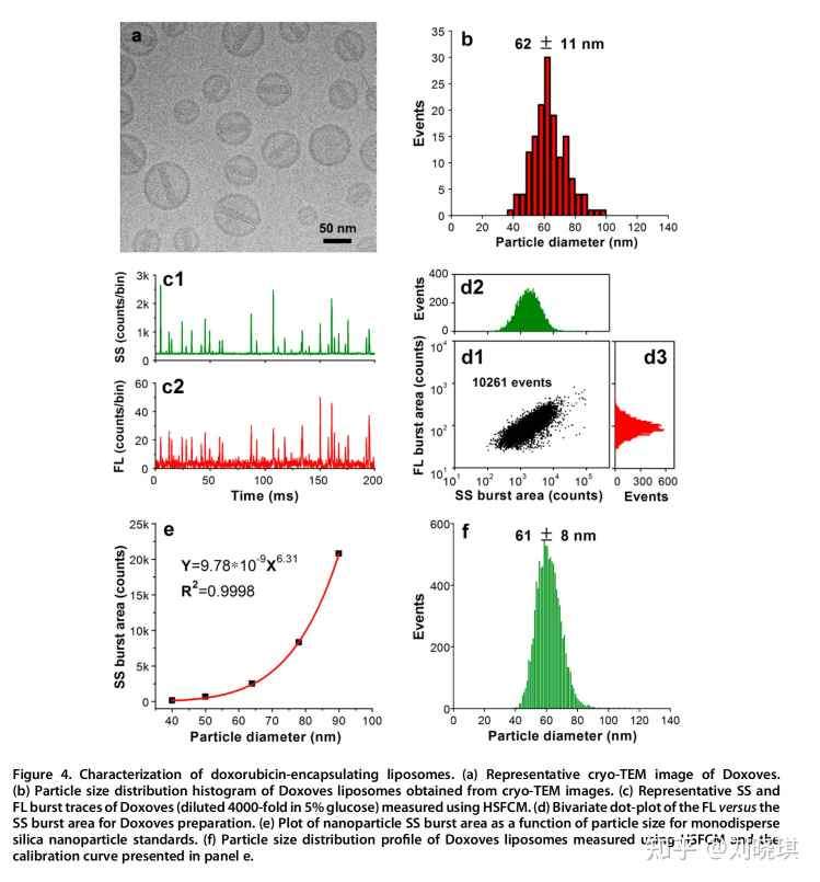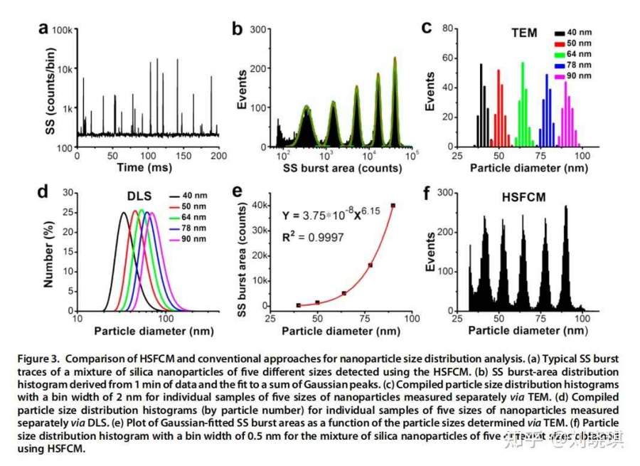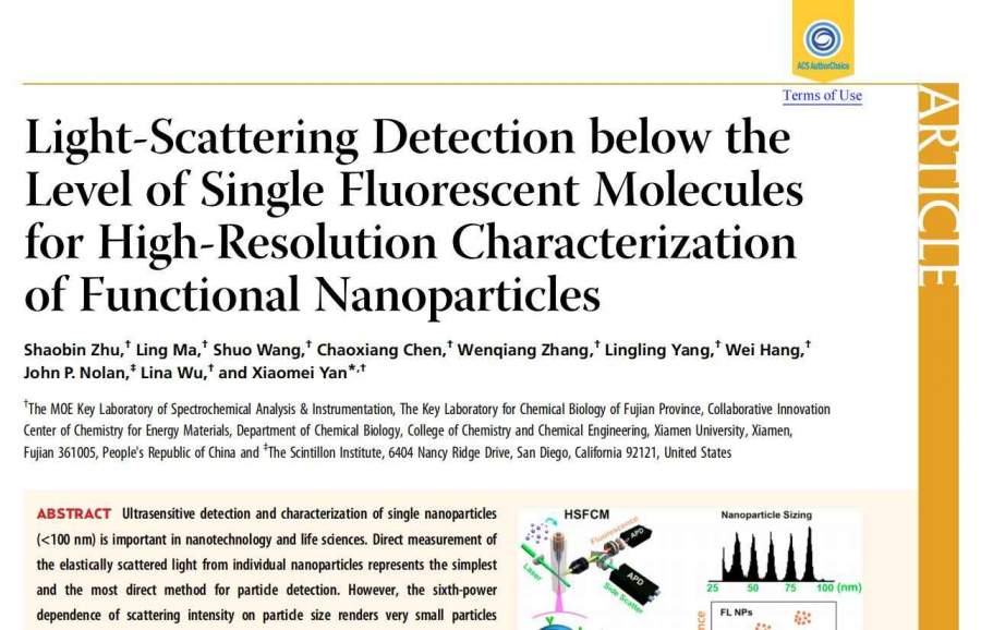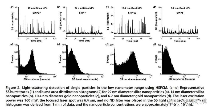 今天分享一篇发表在ACS Nano(2021年IF=15.881)上的文章,名为《Light-Scattering Detection below the Level of Single Fluorescent Molecules for High-Resolution Characterization of Functional Nanoparticles》[1](在单个荧光分子水平的光散射检测,用于功能纳米颗粒的高分辨表征)。 纳米技术的最新进展为开发有效的疾病诊断和治疗方法提供了绝佳机会,因为多种成像剂和治疗药物可以被纳入纳米颗粒(<100nm)中,用于靶向递送。由于这些功能纳米结构材料本质上是不均匀的,在单颗粒基础上进行高分辨率的物理和化学表征对于成功的临床转化至关重要。除了测量颗粒大小分布外,生化特性,如治疗剂封装的数量或偶联到单个纳米载体表面的靶向配体的数量需要进行分析,以对合成具有一致生物活性的纳米药物进行监控。然而,纳米尺度的尺寸和有限的装载分子数量使单纳米颗粒表征成为纳米医学发展的最大挑战之一。虽然单粒子技术在纳米颗粒的检测、大小和计数方面取得了显著进展,但通常缺乏对生化属性的同时评估。 流式细胞术(FCM)是一种成熟的技术,用于高通量、定量和单个细胞和微观颗粒的多参数分析。关于颗粒大小、形状和形态可以通过光散射检测来收集。而生化性质,如核酸含量、酶活性和生物细胞的抗原决定因素,可以通过荧光标记来表征。然而,传统的流式细胞术基于光散射检测直径小于200nm的颗粒是非常困难的。使用定制的流式细胞仪检测单个纳米颗粒和病毒已经付出了巨大的努力,直径为74nm的聚合物纳米颗粒是基于散射可靠检测到的最小粒子。 在光学技术中,弹性光散射是最简单和最直接的粒子检测方法,因为它不需要标签,适用于所有类型的材料,包括非荧光粒子和非金属粒子。虽然单分子荧光检测在实验室已经是常规操作,但单介电纳米颗粒,如脂质、聚合物、介孔二氧化硅和基于病毒载体的传递系统的光散射检测仍然是一个重大挑战。探测到这种粒子的困难有两个主要原因。首先,根据瑞利散射理论,对于尺寸远小于入射光波长的球形纳米粒子,散射光的强度与粒子尺寸有6次方的关系,散射截面(σscatt)由这个公式得出: 其中d为粒子直径,λ为入射光的波长,Nmed为粒子周围介质的折射率,m为粒子与介质的折射率比。这种强烈的尺寸依赖性使得非常小的粒子的散射光强在背景噪声以下迅速消失。例如,直径为25nm的二氧化硅纳米颗粒的散射截面(σscatt)在532nm处仅为0.0081nm^2,不到一些典型单发色团荧光染料的吸收截面(σabs)的1/3(1摩尔消光系数为68 000 M^(-1)cm^(-1)对应0.026nm^2的吸收截面)。第二,用于实现单分子荧光检测的技术,如光谱滤波检测斯托克斯位移荧光发射和时间检测延迟荧光光子自发散射光的排斥,不能将目标粒子的散射光与背景区分开来。为克服测量散射强度的六倍尺度定律,应用了干涉技术,将弱散射场与参考场相结合,检测到的信号随粒径扩展到三倍,而不是六倍。用干涉测量方法可以检测直径为30nm的单聚苯乙烯纳米颗粒和直径为10nm以下的单金纳米颗粒。 本研究提出了高灵敏度流式检测技术(HSFCM)的发展,该技术表明,通过直接测量散射强度,可以将直径小至24nm二氧化硅和7nm的金纳米颗粒弹性散射与背景区分开来。这种前所未有的灵敏度使高分辨率的纳米颗粒检测成为可能。通过同时荧光检测,对阿霉素封装化脂质体和小干扰RNA(siRNA)负载的脂质纳米颗粒的研究,证明了临床纳米医学的定量多参数表征的可能。 研究过程: 一、设备和检测方案 对纳米粒子进行灵敏的光散射检测的方法受到鞘流中单分子荧光检测策略的启发,即减小探测区体积,延长粒子传输时间以增加光子爆发量。然而,在我们早期的仪器设计中,用于荧光检测的单光子计数雪崩光电二极管(APD)探测器由于背景散射容易饱和,不能应用于单个纳米粒子的光散射检测。PMT探测器,检测100nm聚苯乙烯信噪比(S/N)最高达到104。当考虑到光散射与粒子大小的6次方的关系,为了检测介电纳米粒子直径小到几十纳米,需要显著提高灵敏度。图1a为当前HSFCM系统的设计示意图。简而言之,将一种纳米颗粒悬浮液通过锥形石英毛细管(40μm i.d.)引入一个方孔鞘流比色管的中心。高速鞘液流可以将样品流聚焦到一个非常细的流(~1.4μm),穿过聚焦激光束的中心区域(直径~16μm,除非另有说明),在那里辐照最均匀。每个纳米粒子以相同的速度通过激光束,经历相同的辐射场,从而为单个纳米粒子的定量分析提供了基础。垂直于入射激光器的光束和样品流,从样品流发射的光由无限校正的显微镜物镜代替模玻璃凝胶非球面透镜收集,然后由二向色分束器引导进入两条光路进行侧向散射(SS)和荧光(FL)检测。在每条光路中,使用聚焦透镜将激光束与样本流的相交图像投影到APD探测器上。硅APD探测器的活跃面积(直径~180μm)作为一个限制孔径,以排除从探测窗和鞘液流散射的激光。 通过对80nm的荧光二氧化硅纳米颗粒的分析,证实了SS和FL的同时检测,其荧光强度被校准为AlexaFluor532(AF532)的425个等效可溶性荧光色素(MESF)分子(图1b和支持信息图1)。每个通过探测区的纳米颗粒在SS和FL检测通道上都产生一个脉冲或爆发的光电流。对于每一次爆发,检测到的光子的总数被记录为爆发面积。S/N比值以1min内检测到的3551个纳米粒子的平均爆高除以背景信号(噪声)的标准差计算,SS和FL检测得到分别为486和561。还研究了激光功率对SS和FL的影响。虽