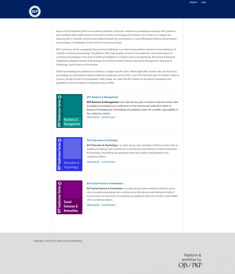 BCP Education & Psychology (ISSN: 2692-7594) https://bcpublication.org/index.php/EP BCP Business & Management (ISSN: 2692-6156) https://bcpublication.org/index.php/BM BCP Social Sciences & Humanities (ISSN: 2692-6172) https://bcpublication.org/index.php/SSH Published By: Boya Century Publishing 出版: 4th International Conference on Art, Design and Cultural Studies (ADCS 2022) 第四届艺术, 设计与文化研究国际会议 (ADCS 2022) 8th International Symposium on Social Science (ISSS 2022) 第八届社会科学国际会议 (ISSS 2022) Boya Century Publishing Limited 会议期刊 :https://blog.researchi.org/boya-century-publishing-limited/ Web:https://www.researchi.org/ BCP Social Sciences & Humanities.png BCP Business & Management.png Boya Century Publishing.png |