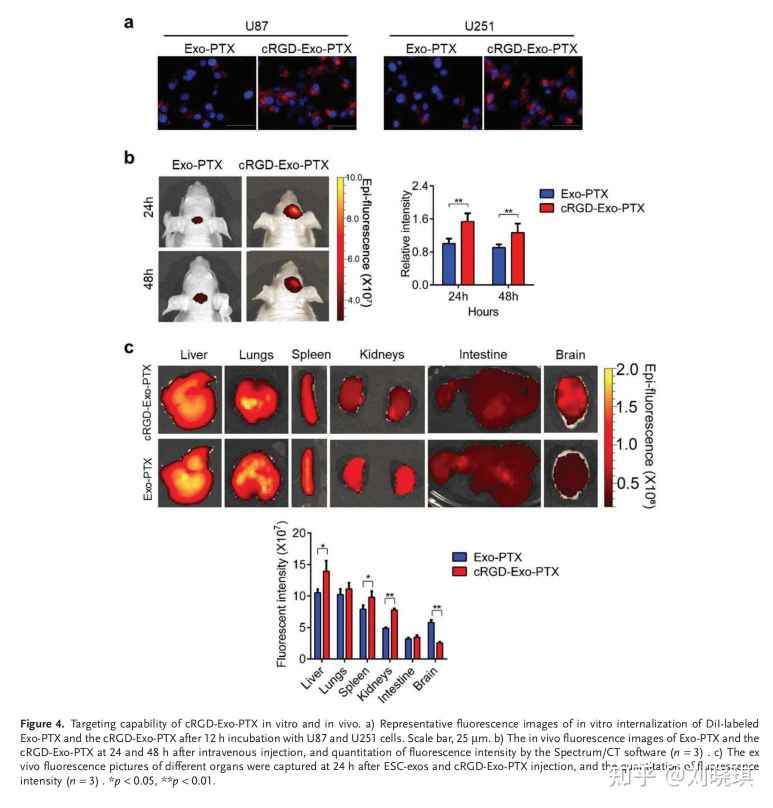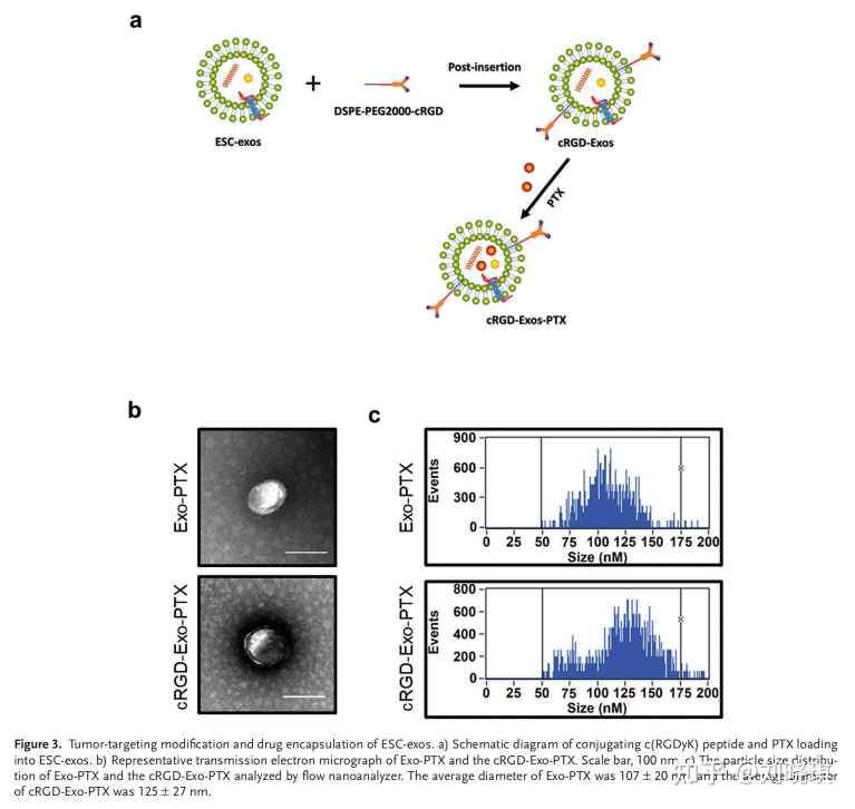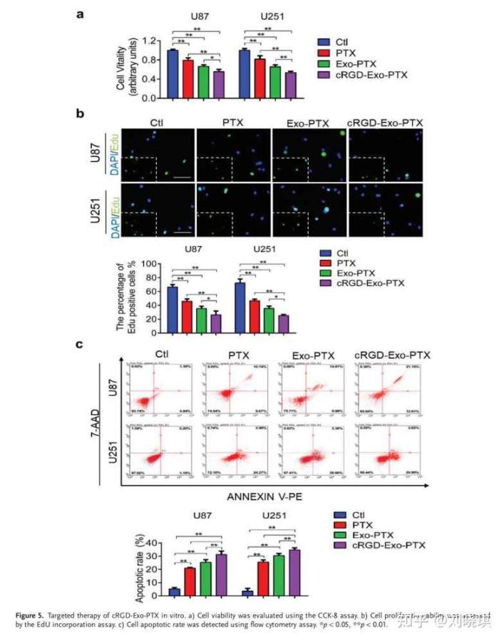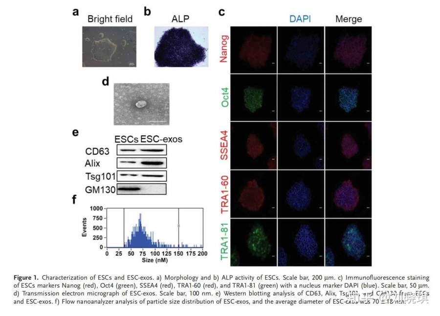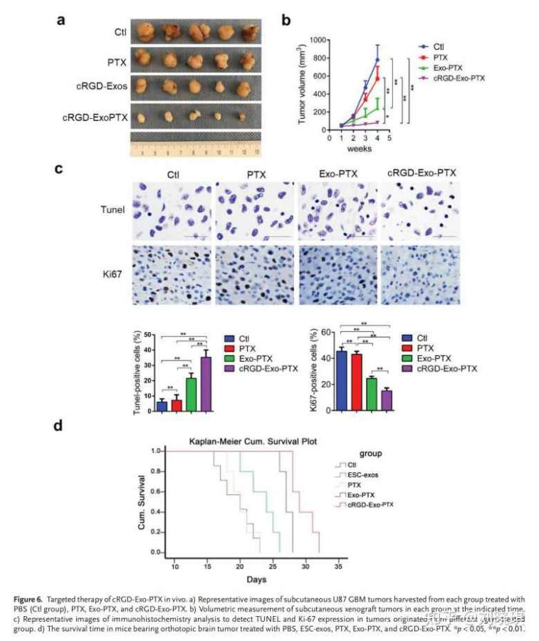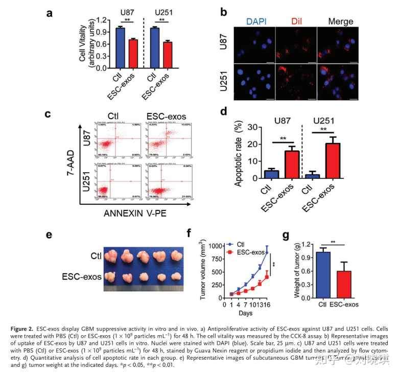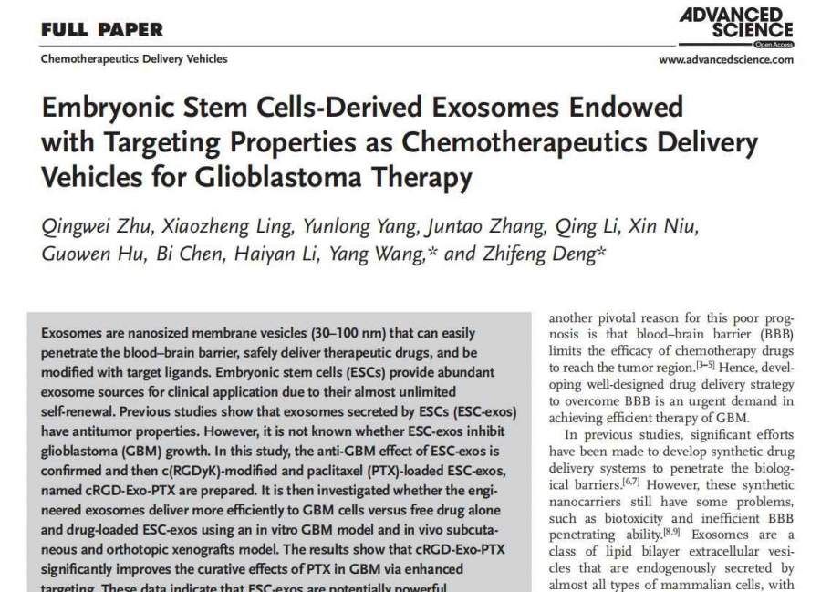 今天分享一篇发表在Advanced Science(2021年IF=16.806)上的文章,名为《Embryonic Stem Cells-Derived Exosomes Endowed with Targeting Properties as Chemotherapeutics Delivery Vehicles for Glioblastoma Therapy》[1](胚胎干细胞来源的外泌体具有靶向特性,可作为胶质母细胞瘤治疗的化疗药物递送载体)。 胶质母细胞瘤(GBM)是中枢神经系统最常见的原发性恶性肿瘤,死亡率和致残率均较高。除了耐药性很高,其不良预后的另一个关键原因是血脑屏障(BBB)限制了化疗药物到达肿瘤区域。因此,专门开发设计药物传递策略来克服血脑屏障是实现GBM有效治疗的迫切需求。 在以前的研究中,人们已经努力开发合成药物传递系统来透过生物屏障。然而,这些合成的纳米载体仍存在生物毒性和血脑屏障穿透能力低下等问题。外泌体是一类双层脂质细胞外囊泡,可由几乎所有类型的哺乳动物细胞分泌,粒径分布为30-100nm,通过将分子从亲本细胞运输到受体细胞来响应细胞间的通信。在天然衍生的纳米载体种,外泌体由于其低生物毒性和多种的生物功能,如免疫特性、装载物保护和最重要的生物屏障穿透能力,被认为是优秀的药物传递纳米载体。据报道,外泌体由于其特殊的表面结构,如四酯酶蛋白和整合素,而表现出内在的组织或细胞靶向特性。此外,通过工程表面分子可以获得更好的外泌体靶标能力。尽管基于外泌体的药物载体取得了进展,但还应该确定一种适合外泌体衍生的细胞类型。 人胚胎干细胞(ESCs)是一种来自囊胚内细胞团的多能干细胞,可以在体外培养中几乎无限期保持未分化。此外,它们也具有无限增殖的能力。因此,ESCs可以大规模产生具有稳定特性的外泌体(ESC-exos),这是外泌体临床应用的重要因素。此外,ESC微环境已被证实可以抑制癌细胞的致癌表型。研究表明,恶性癌细胞在胚胎微环境中被重新编程为分化程度更高、侵袭性更低的表型。ESC-exos含有反映胚胎微环境含量的物质,这可能是ESCs介导的抗肿瘤作用的主要效应因素。此外,有研究发现ESC-exos可以将人类乳腺癌细胞重新编程为一个较低恶性的细胞表型。因此,与其他类型的细胞相比,ESCs是非常适合量产外泌体,可以在癌症治疗中开发基于外泌体的化疗载体。 然而,尽管外泌体显示出穿透血脑屏障的能力,但许多研究表明,静脉注射的外泌体主要分布在肝脏或脾脏,并且极小部分注射的外泌体保留在大脑或肿瘤部位。因此,在使用ESC-exos治疗胶质瘤之前,应该采取有效的策略来解决这个问题。用肿瘤靶向配体直接修饰外泌体表面已被证明可以有效增强外泌体的肿瘤滞留。Cyclo(Arg-Gly-Asp-D-Tyr-Lys)肽(c(RGDyK))是一种著名的癌症化疗靶向配体,与αvβ3整合素受体具有高亲和力,αvβ3整合素受体在GBM、前列腺癌和肺癌等肿瘤组织积极增殖的内皮表面过表达。这些研究表明,用c(RGDyK)修饰的纳米载体可以更有效地将化疗药物传递到癌细胞中,并能显著提高抗肿瘤效果。此外,用c(RGDyK)修饰的外泌体具有较强的穿过血脑屏障的能力。然而,用c(RGDyK)修饰的ESC-exos是否能增强ESC-exos在胶质瘤部位的分布,并提高胶质瘤的治疗效率,目前尚不清楚。 基于上述陈述,本研究开发了一种通过c(RGDyk)肽修饰ESC-exos的肿瘤靶向肿瘤(cRGD-ESC-exos)传递系统,用于胶质瘤治疗,希望通过结合ESC-exos的先进特性和靶向配体,可以开发出一种有效的基于外泌体的策略,用于胶质瘤的治疗,我们的工作也可以促进ESC-exos在药物传递中的应用。 研究过程: 一、ESCs和ESC-Exos的表征 在Matrigel上培养的ESCs形成了一个紧密的尖锐边缘菌落(图1a)。免疫染色分析显示,细胞球中所有细胞均表达碱性磷酸酶(ALP,图1b)和多能性标记分子,包括Nanog、Oct4、SSEA4、TRA1-60和TRA1-81(图1c)。培养细胞的这些特征与ESCs的特征相一致。之后,从细胞培养上清中纯化ESC-exos,并通过透射电子显微镜(TEM)、免疫印迹和纳米流式分析仪(NanoFCM)进行表征。透射电镜图像清楚地显示,ESC-exos呈圆形形态,直径约为75nm(图1d)。Western blot证实ESC-exos表达外泌体特异性标记物CD63、Alix和TSG101,不表达阴性标记物高尔基膜结合蛋白GM130(图1e)。纳米流式分析显示,平均直径为70.2±18nm(图1f),ESC-exos的浓度约为1×10^11颗粒/mL。这些数据表明,我们已经成功地从ESCs培养基中提取和纯化了ESC-exos。 二、ESC-Exos在体外和体内均显示GBM抑制活性 为了确认ESC-exos是否具有广泛的抗癌活性,特别是对GBM,我们培养了6种癌细胞系,包括人GBM细胞系(U87和U251)、肺癌细胞系(A549)、肝细胞癌(HCC)细胞系(HepG2)、黑色素瘤细胞系(B16)、乳腺癌细胞系(MDA-MB-MB-231)和前列腺癌细胞系(DU145),在含ESC-exos(1×10^9颗粒/mL)的培养基中培养48h。如图2a和图S1所示,细胞活力试验(CCK-8试验)显示,ESC-exos显著降低了这些癌细胞的活力。为了进一步证实ESC-exos在GBM细胞中的作用,我们使用U87和U251细胞系进行了后续实验。 为了对U87和U251细胞发挥作用,ESC-exos需要被这些细胞吸收。因此,ESC-exos用亲脂性荧光染料DiI标记,加入U87和U251细胞培养基中。孵育12h后,ESC-exos被U87和U251有效内化(图2b)。为评价细胞凋亡的影响,采用AnnexinV-PE/7-AAD标记进行流式细胞术检测ESC-exos(1×10^9颗粒/mL)处理后细胞凋亡的诱导作用。与对照组相比,ESC-exos组的凋亡细胞百分比显著增加(图2c,d)。这些数据表明,ESC-exos通过抑制细胞活力和促进细胞凋亡影响GBM细胞生长。 为了评估ESC-exos是否能够影响体内GBM的生长,我们进行了携带皮下U87GBM异种移植