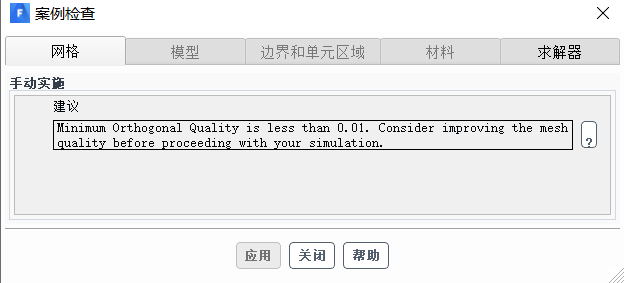 FLUENT新手小白,咨询如下问题,希望各位虫友施以援手,不胜感激! 如图所示,我在做一个ANSYS FLUENT 稳态仿真时,设定迭代500次,结果50多次时候报错:结果(连续性)不收敛。另外网格质量如何改善呢,模型检查时出现“Warning: minimum Orthogonal Quality below 0.01” 收敛错误.png 模型检查警告png.png |