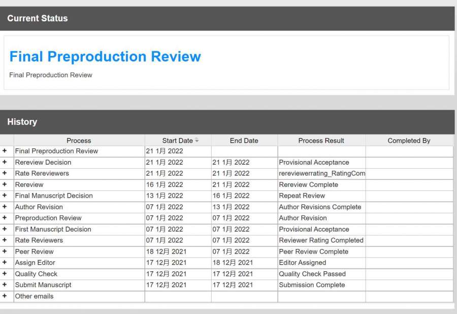 最近楼主投了OL,一轮审稿后评级是provisional acceptance,修改后又返回给审稿人,审稿意见回来之后的状态又变成provisional acceptance,目前停在preproduction4天了,从没遇到过这种情况,想问是会再给一轮修改吗,还是直接接收/拒稿呢 发自小木虫Android客户端 |