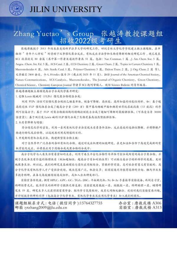 吉林大学化学学院张越涛教授课题组招收考研生