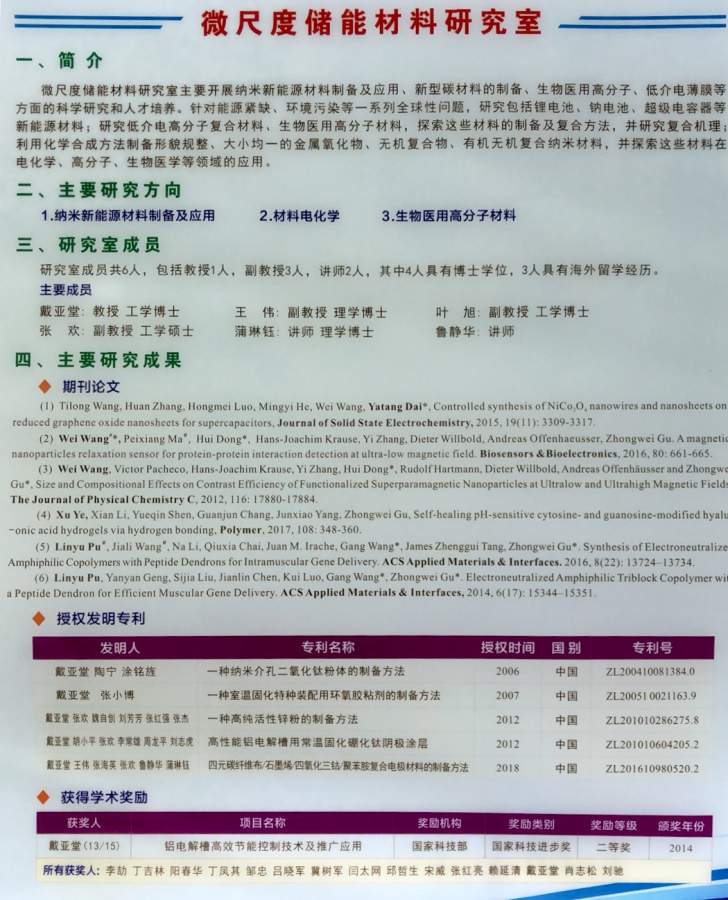 只接受邮件申请,名额有限请尽快! 研究方向:无机纳米材料、电化学超级电容器。详细简介见附图。 课题组有稳定的经费支持研究生的科研需求,且每个月按时给予学生一定的补贴。 请编写申请表,排版不限,内容需包含:1.基本信息:姓名、照片、性别、出生年月、现居地、兴趣爱好、本科院校、本科专业名称、联系方式;2.科研情况:英语水平成绩、本科阶段参与科研/进入实验室工作情况、毕业论文题目(若未开展,请填写计划的研究方向)、本科阶段主修课程(6门左右,不列举分数);3.成果情况:列举论文、专利及参与的项目(需注明自己是第几作者/负责人);4.初试成绩:报考院校及专业、各个学科初试成绩(如:英语50分;数学,110分...)。 请将申请表发邮件至:swust511512@163.com,邮件标题统一为:姓名-初试分数-本科学校-本科专业。 通过初步筛选后我们会和你取得联系。 课题组简介.jpg |