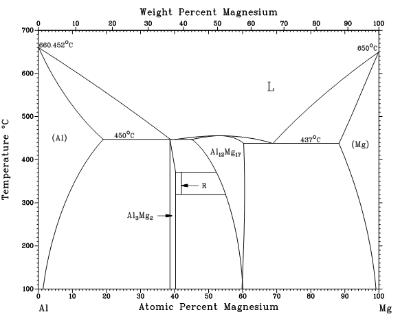 | 求助大侠,给个对镁铝二元相图详细的解释,包括各个区域分别是什么相,等。不胜感激!!! |