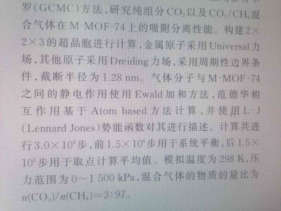 | mof-74中的金属原子用uff力场,而配体骨架结构用dreding力场,而吸附的气体分子通常用trappe力场,sorption做混合力场需要编辑一下。首先需要将MOF.xsd以car结构导出,得到MOF.car和MOF.mdf均用写字板打开,在MOF.car文件中将倒数第三列改为自己想要的符号,如C_R。注意字符不能太多(<4个),否则力场文件中将无法识别,同时设置MOF.mdf文件。保存后重新导入MS,通过右键/Label/Forcefield Type查看设置的力场类型是否正确;然后,用写字板打开一个力场文件,将上述设置的力场类型写入到ATOMTYPES中,最后,在DIAGONAL_VDW部分按照已有参数的格式加入新力场类型的两种力场参数σ和ε,单位分别为Å和kcal/mol,力场文件编辑完毕 |