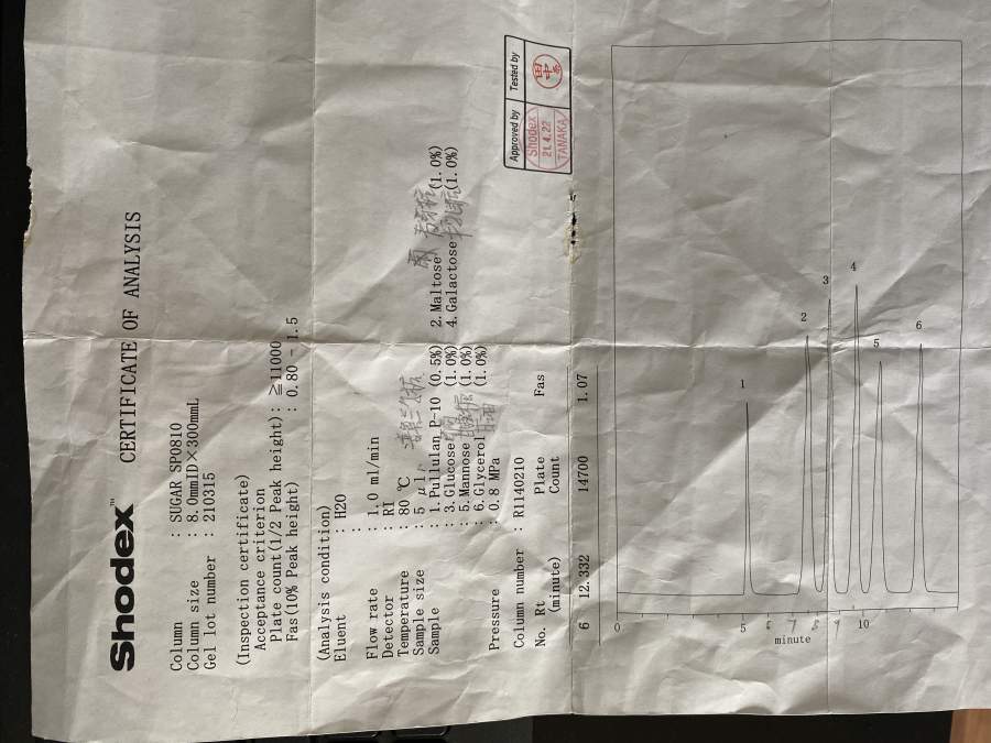 求助:有没有老师知道SP0810糖柱(流动相为水)在测糖的时候,液相色谱图的基线不平,且不能将糖峰完全分开,条件都是按照说明书设置的,有没有用过这种柱子的老师知道一些比较好的方法呢,求告知,谢谢啦 1.jpg 2.jpg 3.jpg |