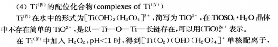最近看一些关于四价钛离子的内容。在无机化学 张祖德版本的书中看到四价钛离子在水中通常以TiO2+的形式存在,为什么会以这种形式存在呢?为什么不是常规的Li+ Na+那样的,而是这种钛酰呢? 微信图片_20220309193306.png |