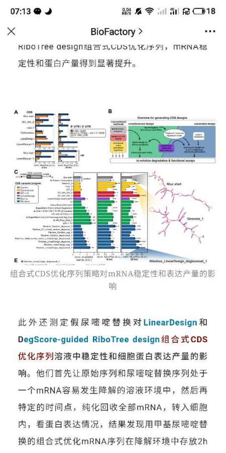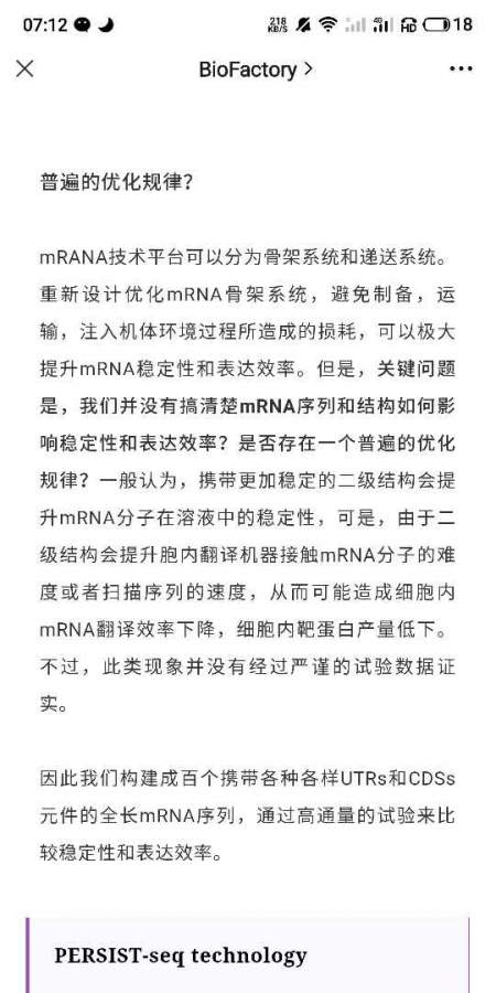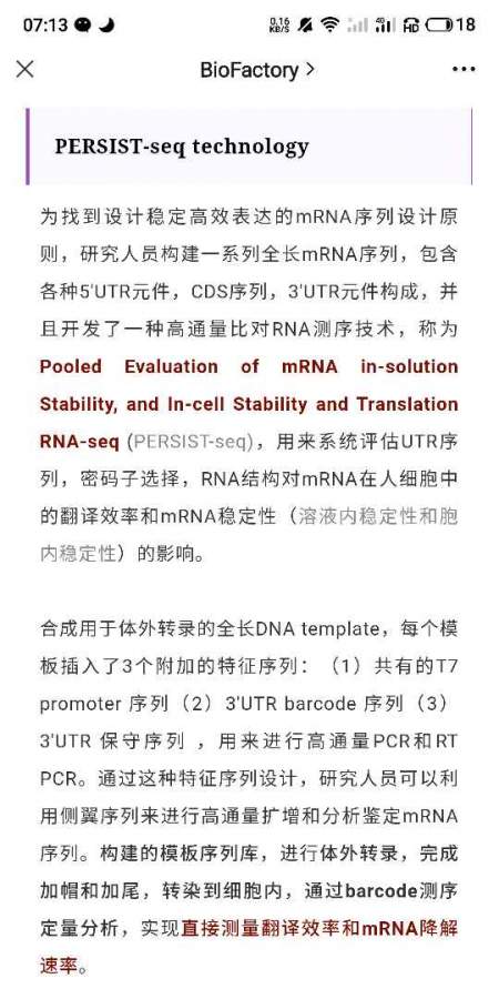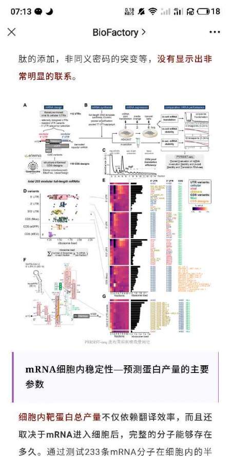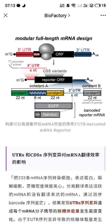 为找到设计稳定高效表达的mRNA序列设计原则,研究人员构建一系列全长mRNA序列,包含各种5'UTR元件,CDS序列,3'UTR元件构成,并且开发了一种高通量比对RNA测序技术,称为?Pooled Evaluation of mRNA in-solution Stability, and In-cell Stability and Translation RNA-seq?(PERSIST-seq),用来系统评估UTR序列,密码子选择,RNA结构对mRNA在人细胞中的翻译效率和mRNA稳定性(溶液内稳定性和胞内稳定性)的影响。