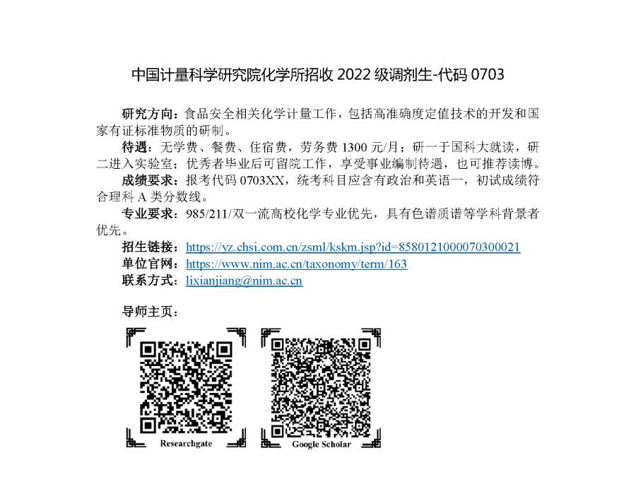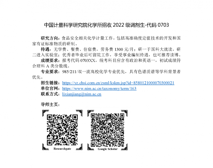 研究方向:食品安全相关化学计量工作,包括高准确度定值技术的开发和国家有证标准物质的研制。 读研待遇:无学费、餐费、住宿费,劳务费1300元/月;研一于国科大就读,研二进入实验室;优秀者毕业后可留院工作,享受事业编制待遇,也可推荐读博。 成绩要求:报考代码0703XX,统考科目应含有政治和英语一,初试成绩符合理科A类分数线。 专业要求:985/211/双一流高校化学专业优先,具有色谱质谱等学科背景者优先。 导师主页:https://www.researchgate.net/profile/Xianjiang-Li-2 招生链接:https://yz.chsi.com.cn/zsml/kskm.jsp?id=8580121000070300021 单位官网:https://www.nim.ac.cn/taxonomy/term/163 联系方式:lixianjiang@nim.ac.cn 招生简介-李先江.png |