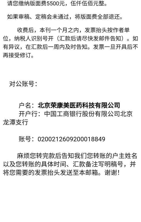 楼主,您好,您最后发表了嘛?我也投了这个杂志,我收到这个版面费的通知,转账单位跟您的一样,不晓得真假。并且它邮件通知的意思有点像,就算交了版面费也可能不录用你的意思, 发自小木虫Android客户端 |