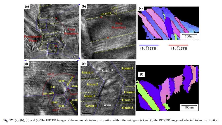 各位前辈好,最近在阅读阿尔法-Ti孪晶类型方面的文献,这是看到的一篇文献中的标定图,对于TC4的变形孪晶的分析,PED IPF显示是两种变形孪晶,从b、d、e的高分辨显示是不是只有{10-11}孪晶,附上论文的全文,不知道进动电子衍射(PED)分析孪晶类型是不是准确,还是需要提供更精确的选区衍射图, 个人感觉(d)图中标注的{10-10}不太对,应该是{0001}晶面,请教这方面比较专业的前辈指点迷津,不知道我理解的对不对,谢谢 发自小木虫IOS客户端 |