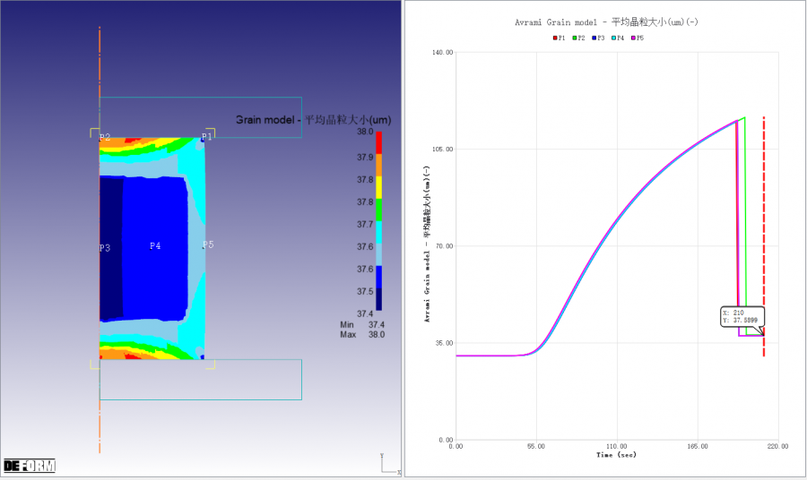 用deform模拟工件加热(炉温1200摄氏度,加热时间180s),上模开始进行挤压,图1是选取五个点的晶粒细化曲线,图二是模具的时间速度图,但是为什么图一的晶粒尺寸会出现断崖式下跌呢?不懂